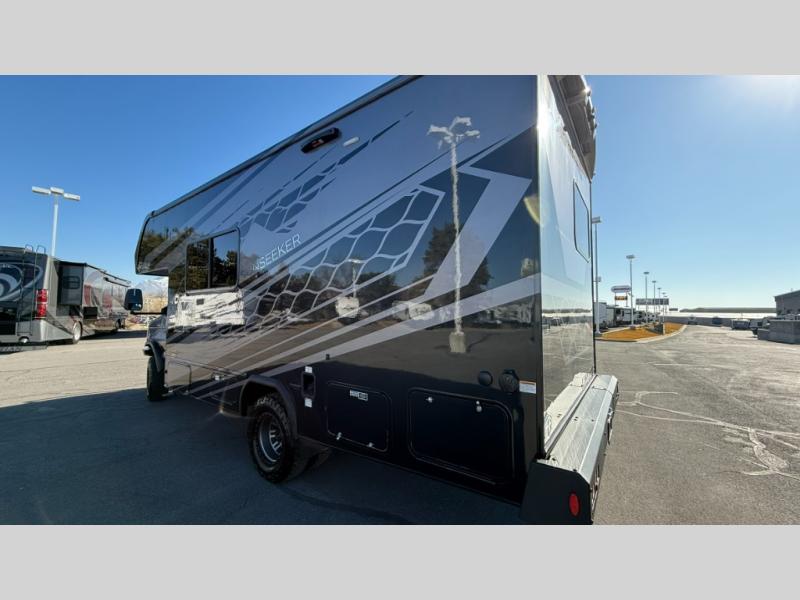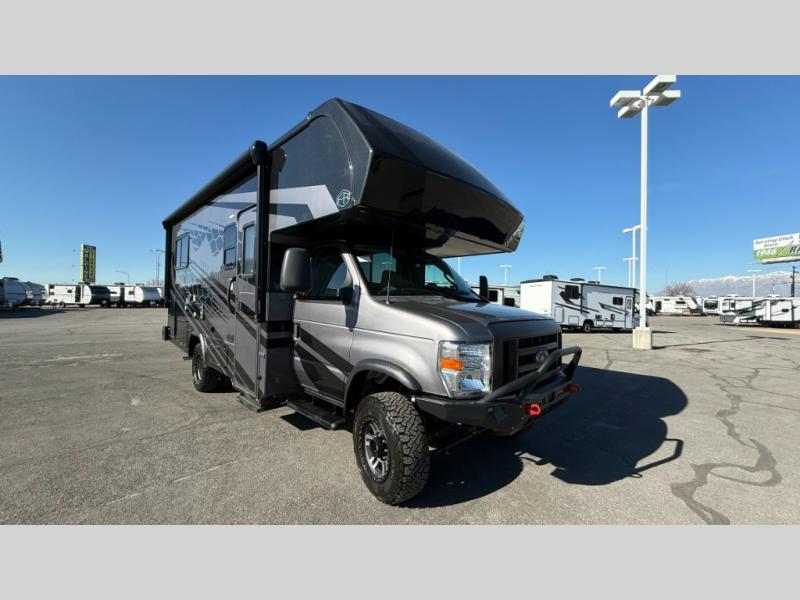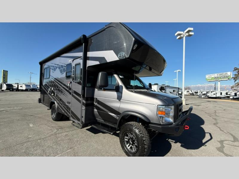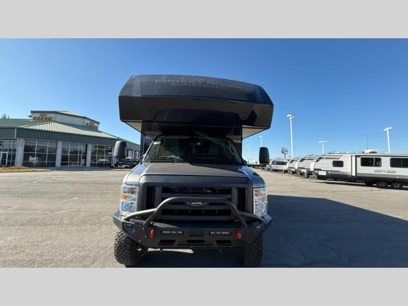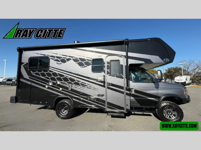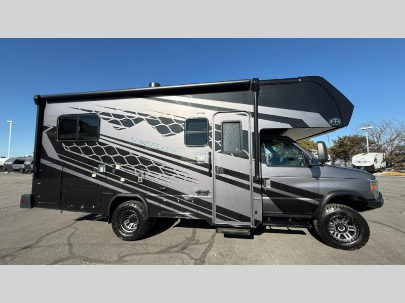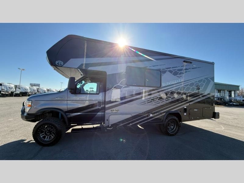 The Forest River Sunseeker Class C gas motorhome with the 4x4 Off-Road Extreme Package is ready for adventure when you are! It sits on a durable Ford E450 chassis with 4-wheel drive and 4" lift kit so you can tackle tougher terrain and back roads. There are also upgraded off-road wheels and tires, upgraded Bilstein BG 4600 off-road shocks, and an upgraded front bumper with brush guard and off-road lights. You will love the sleek full-body paint, along with carbon fiber accents, back up camera system, and the heavy-duty industrial flooring that will withstand your adventurous lifestyle. Additional features include power mirrors, a 7,500 lb. towing hitch, an LP Quick Connect, and a 200-watt solar 12V charging system for off-grid capabilities!