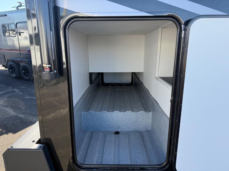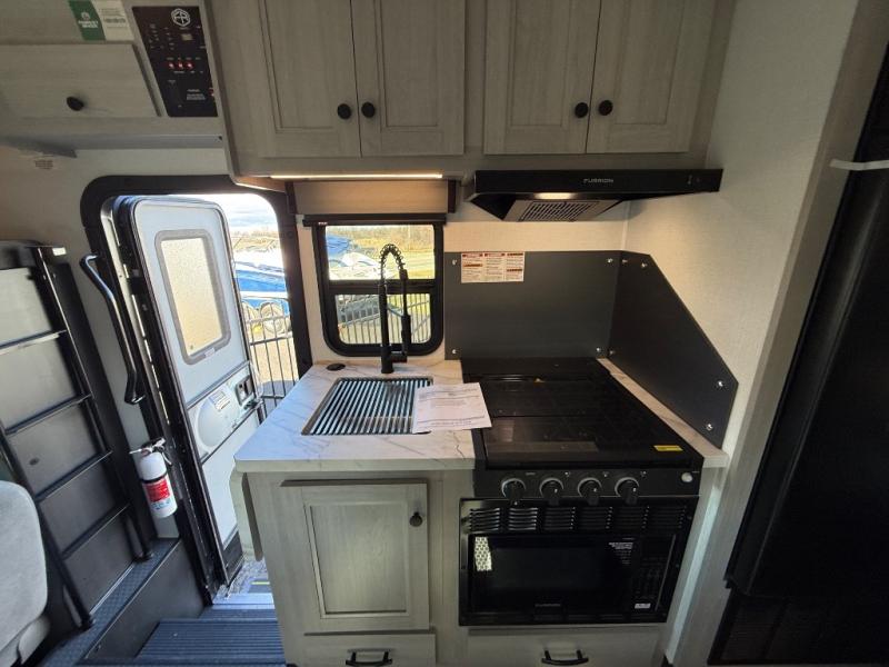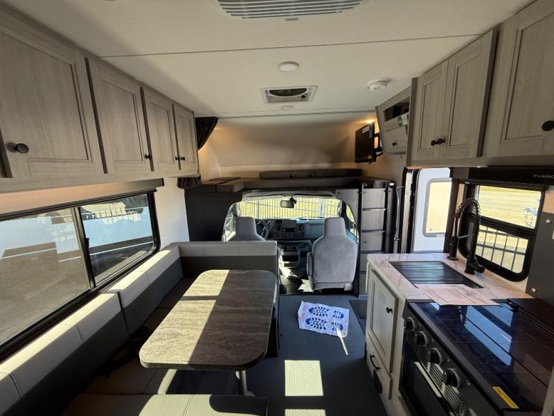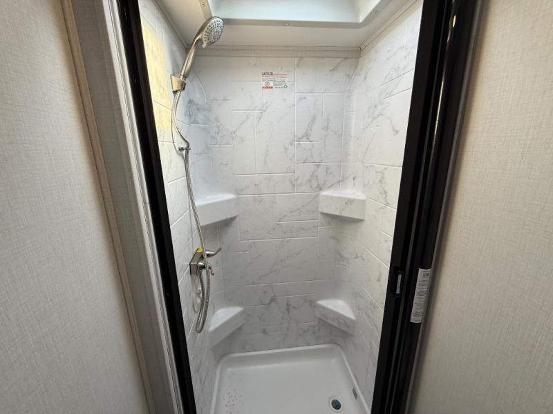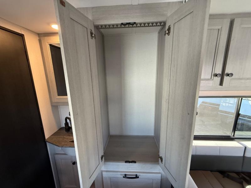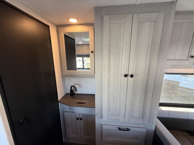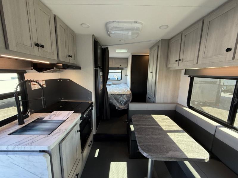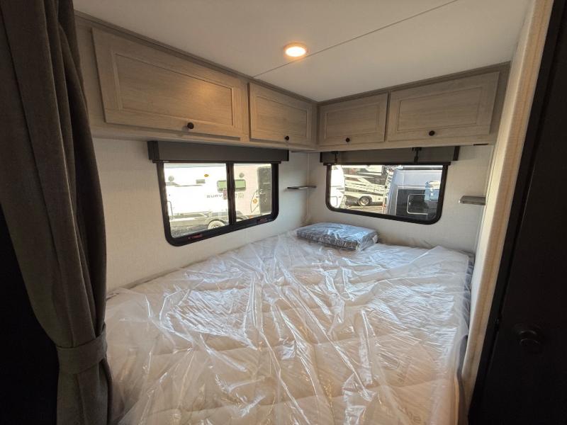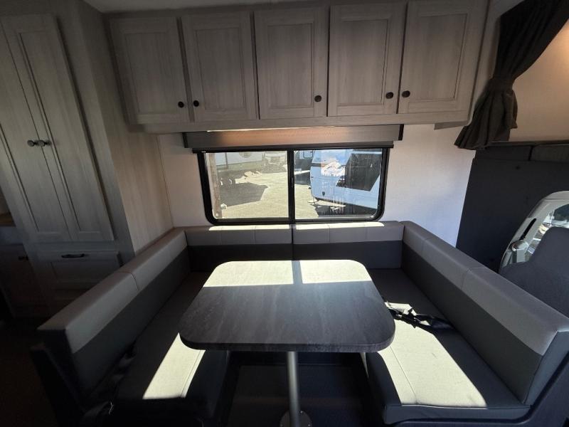 Travel in style with your own accommodations in this coach. You'll find a queen-size cab-over bunk that can be utilized as extra sleeping space or even storage, plus the rear corner offers a queen bed. And don't forget about the U-dinette as extra sleeping space after dining, playing games and relaxing. The kitchen offers a 10-cu. ft. 12V refrigerator, a convection/microwave/air fryer, and a flip-up countertop for more prep space. The private toilet and shower gives you a place to get cleaned up, and the bathroom sink is just outside the door allowing someone else the ability to get ready at the same time.