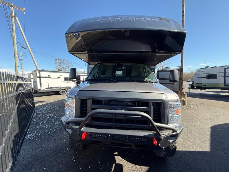 The Forest River Sunseeker Class C gas motorhome with the 4x4 Off-Road Extreme Package is ready for adventure when you are! It sits on a durable Ford E450 chassis with 4-wheel drive and 4" lift kit so you can tackle tougher terrain and back roads. There are also upgraded off-road wheels and tires, upgraded Bilstein BG 4600 off-road shocks, and an upgraded front bumper with brush guard and off-road lights. You will love the sleek full-body paint, along with carbon fiber accents, back up camera system, and the heavy-duty industrial flooring that will withstand your adventurous lifestyle. Additional features include power mirrors, a 7,500 lb. towing hitch, an LP Quick Connect, and a 200-watt solar 12V charging system for off-grid capabilities!