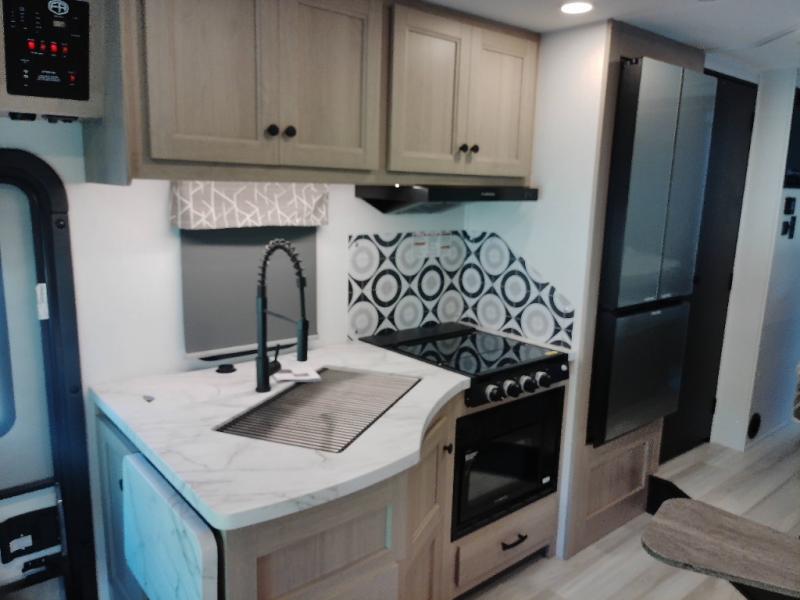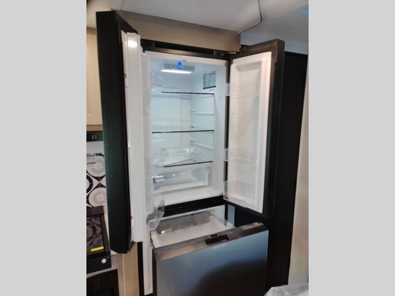 A lot of convenience has been packed into this coach with the full rear bathroom, the master suite, a complete kitchen, two TVs, and a bunk above the cab. An added bonus is the U-shaped dinette which can serve as a dining space or sleeping space depending on how you have it set up. If you don't need the bunk above cab for sleeping space, you could change it out for the optional Trekker cap with built-in entertainment center and storage. The kitchen is equipped with all of your favorites: a pantry, a convection microwave, a three-burner range, a flip-up countertop, and a 10.7-cubic foot refrigerator.