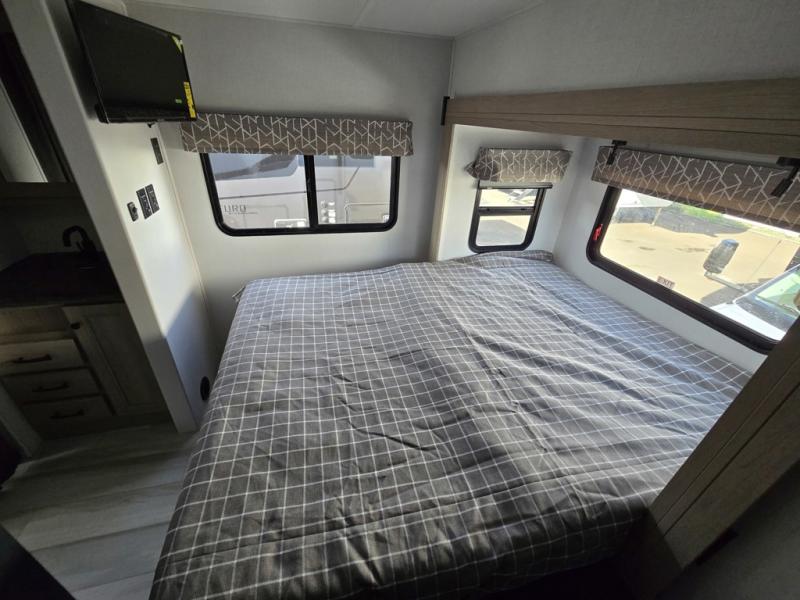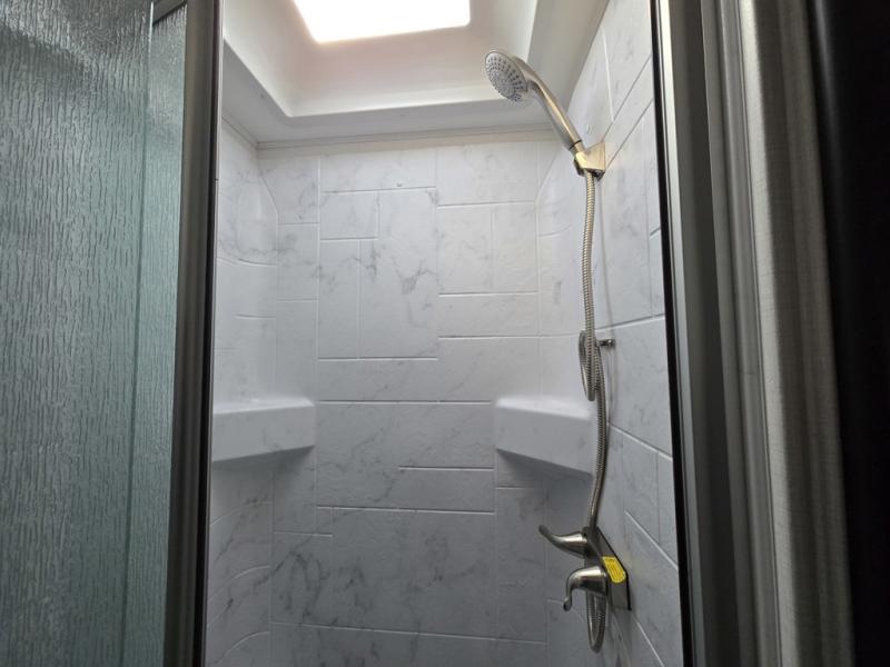 This motorhome has a rear private bedroom that holds the queen-size bed on a unique rear slide out. The bedroom also has its own 12V TV and wardrobe slide, so you have extra space without adding travel length. Another slide holds the U-shaped dinette out in the main living area, and you can watch the second LED TV out there. The bathroom has the toilet and 24" x 36" shower on one side of the coach and the medicine cabinet and sink on the other side so two people can freshen up at once. The kitchen has everything needed for a full weekend of delicious meals with the pantry, convection microwave, flip-up countertop, and 10.7-cubic foot refrigerator.