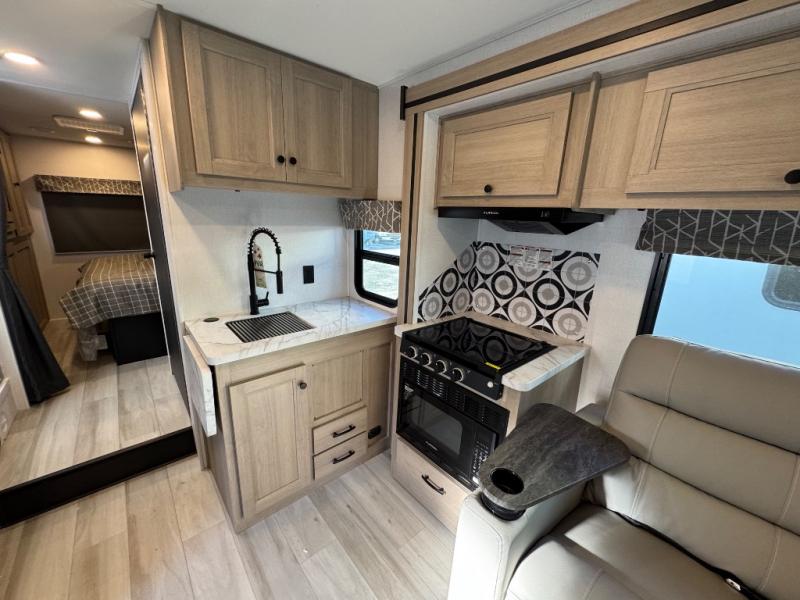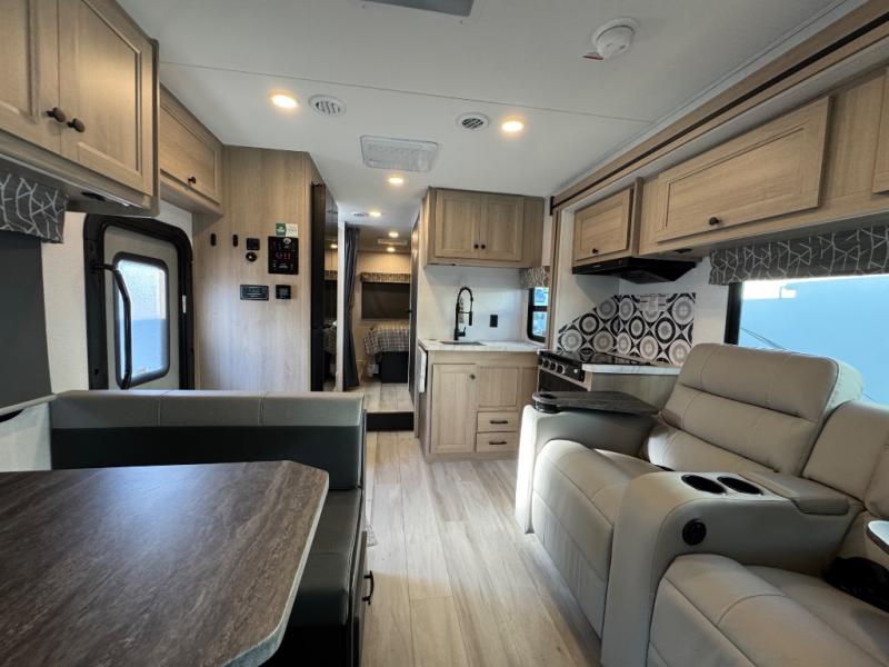 With any Sunseeker Classic Class C gas motorhome by Forest River, you will enjoy more features and quality construction at a great value! Each model comes standard with a fiberglass roof and 2" aluminum framed laminated sidewalls for maximum durability. The Winegard Air 360+ digital antenna is your all-in-one solution for your internet, TV, and FM signal needs, and you have Gateway 4G Wi-Fi capability too. The exterior has an outside shower, heated/enclosed tanks, Rotocast storage compartments, and a power awning with an LED light strip to name a few conveniences. Each drive will be made easy thanks to a 10" touchscreen CarPlay/Android radio with USB and Bluetooth, backup camera/side view cameras with a 3-way monitor, and Ultraleather seating for added comfort. You'll also love the black out roller shades, soft touch self-closing drawer guides, oxygen-infused shower head with a flexible extension, and many more interior comforts!