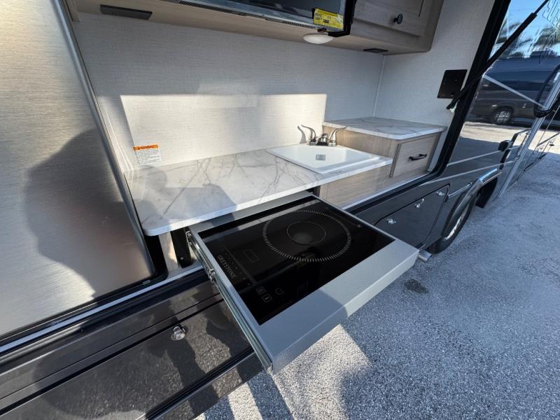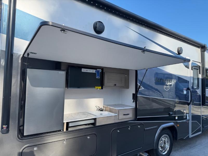 Grab your sunhat and your adventurous spirit and head out with this Sunseeker Classic Class C gas motorhome! There is a rear private bedroom to change your clothes and sleep soundly, and the RV queen bed slide adds more space to this area. The split-style bathroom has a 24" x 36" shower on one side of the coach while the lavatory and vanity stay secluded on the other side. If you don't need the extra sleeping space from the bunk over the cab, you can choose to add the optional Trekker cap with a built-in entertainment center and storage in its place. Sit back with a big bowl of cereal at the booth dinette, or get a little more comfortable on the sofa. You can also go outside to prepare some heartier food at the outdoor kitchen.