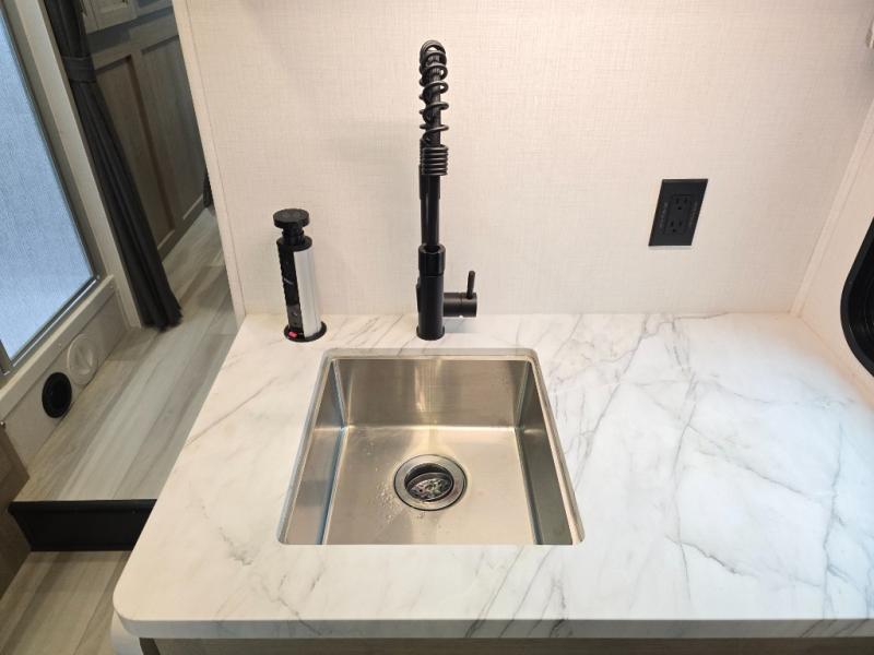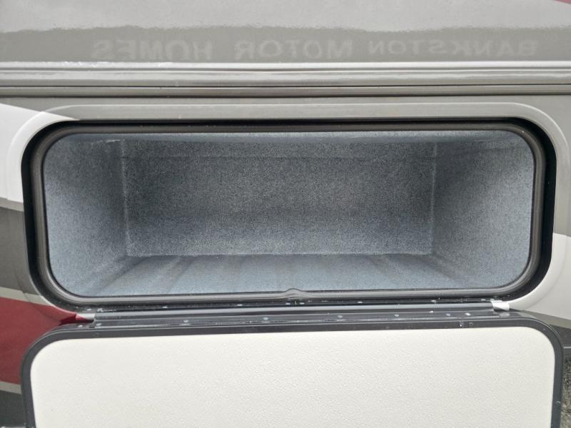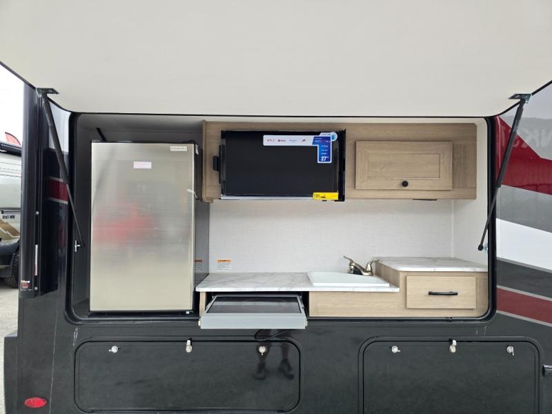 Grab your sunhat and your adventurous spirit and head out with this motorhome! There is a rear private bedroom to change your clothes and sleep soundly, and the RV queen bed slide adds more space to this area. The split-style bathroom has a 24" x 36" shower on one side of the coach while the lavatory and vanity stay secluded on the other side. If you don't need the extra sleeping space from the bunk over the cab, you can choose to add the optional Trekker cap with a built-in entertainment center and storage in its place. Sit back with a big bowl of cereal at the booth dinette or get a little more comfortable on the sofa. You can also go outside to prepare some heartier food at the outdoor kitchen.