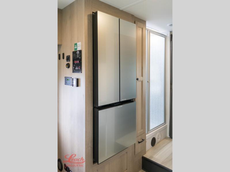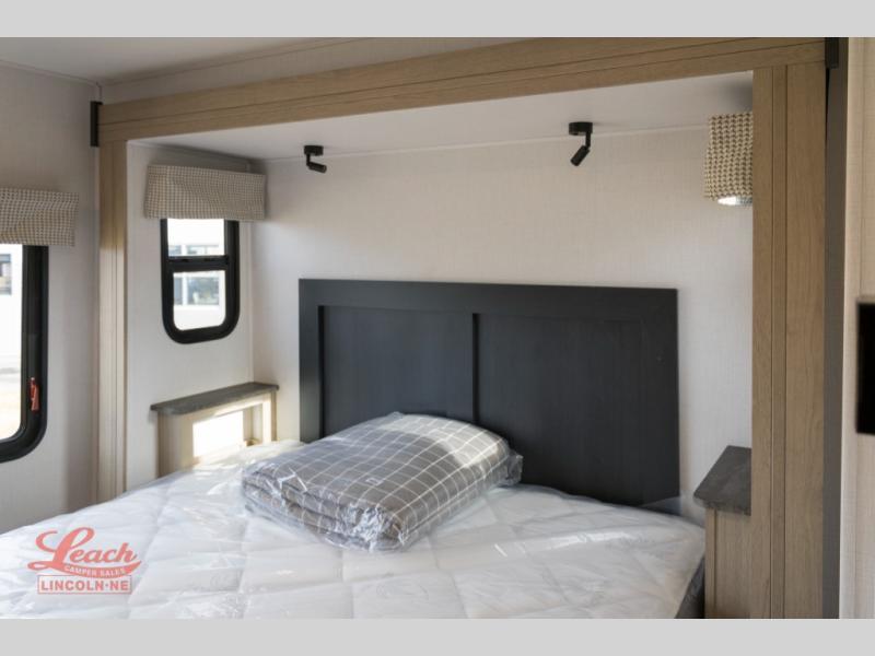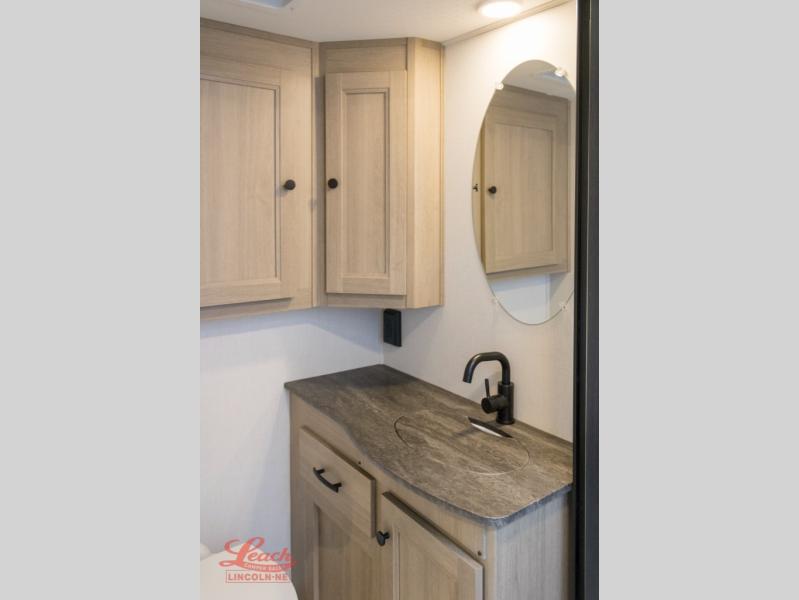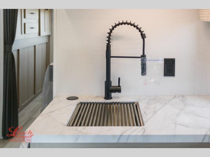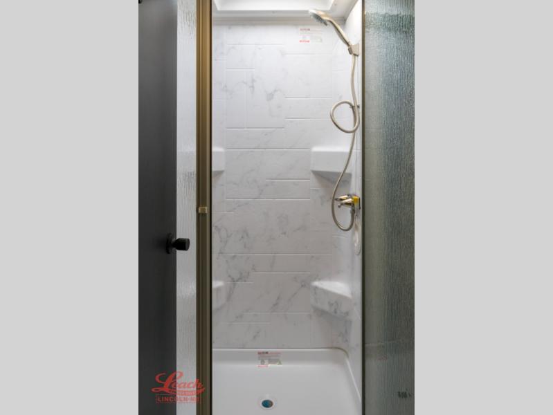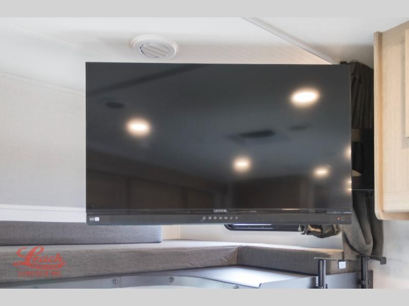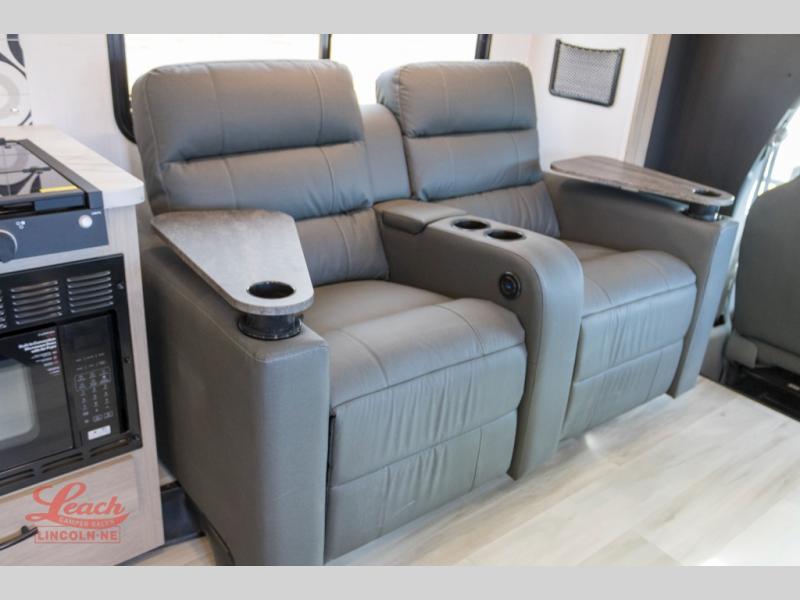Grab your sunhat and your adventurous spirit and head out with this motorhome! There is a rear private bedroom to change your clothes and sleep soundly, and the RV queen bed slide adds more space to this area. The split-style bathroom has a 24" x 36" shower on one side of the coach while the lavatory and vanity stay secluded on the other side. If you don't need the extra sleeping space from the bunk over the cab, you can choose to add the optional Trekker cap with a built-in entertainment center and storage in its place. Sit back with a big bowl of cereal at the booth dinette or get a little more comfortable on the sofa. You can also go outside to prepare some heartier food at the outdoor kitchen.