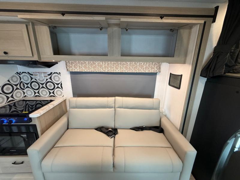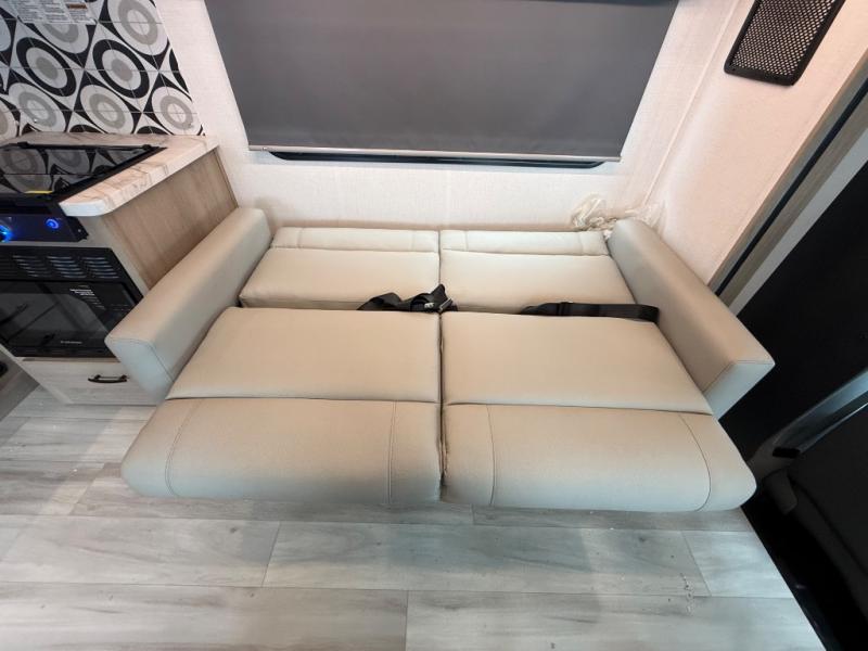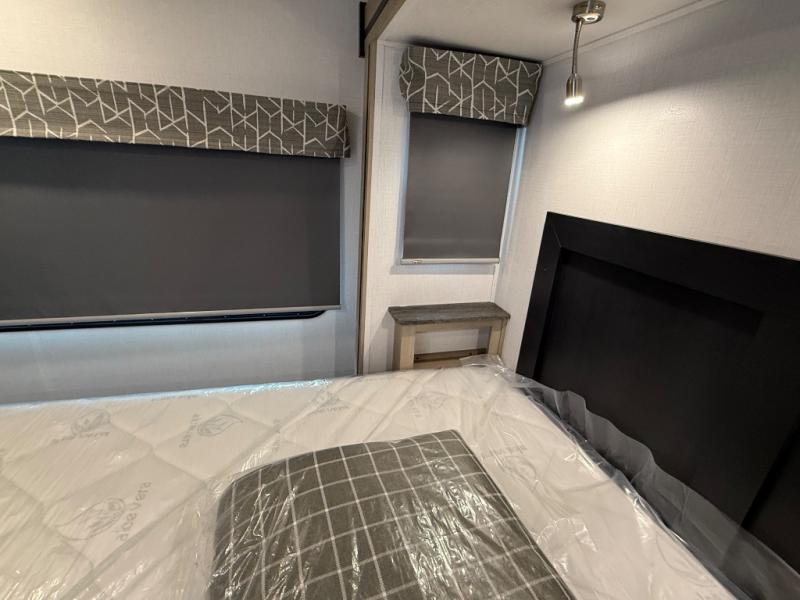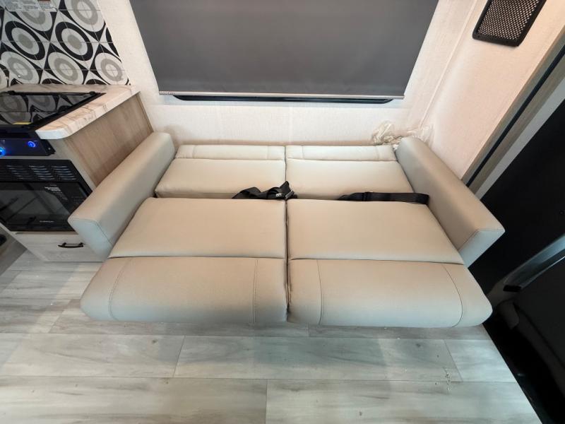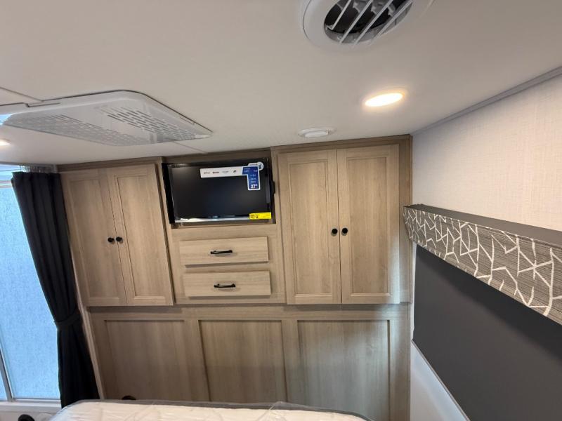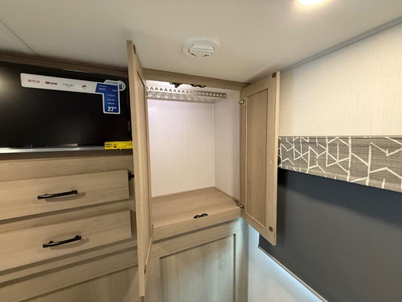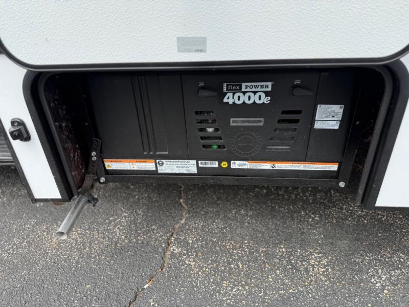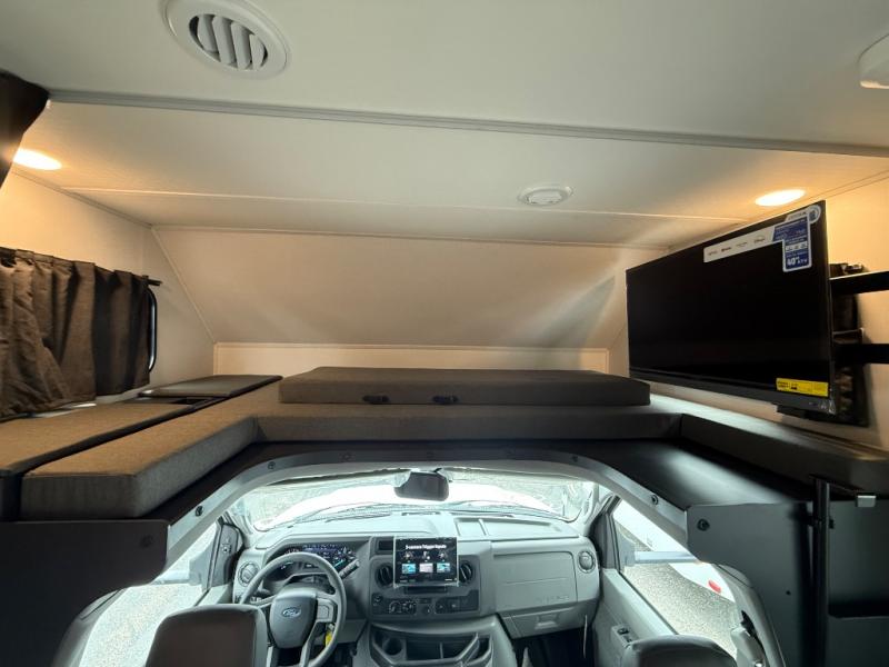 Sleeping Capacity: Accommodates up to 7 people with a rear RV queen bed, cab-over bunk, convertible dinette, and optional theater seating.