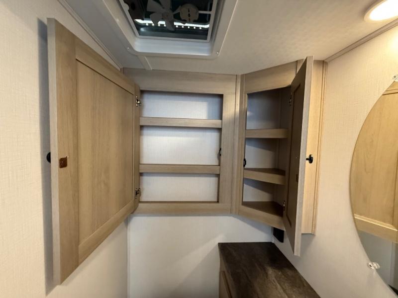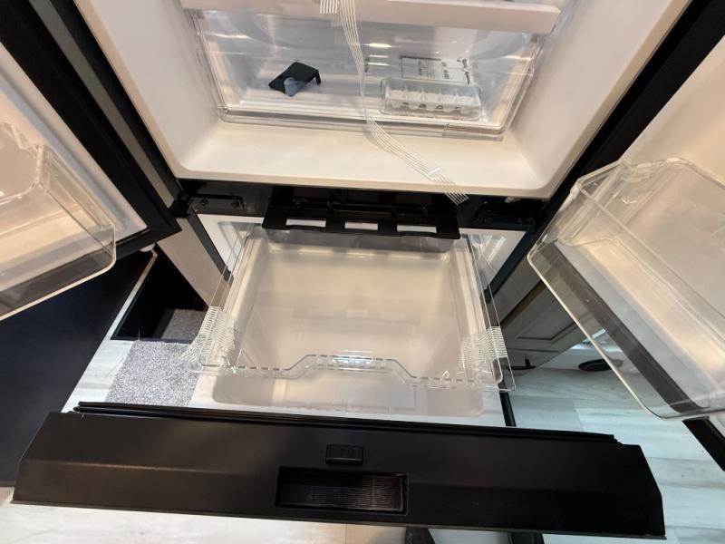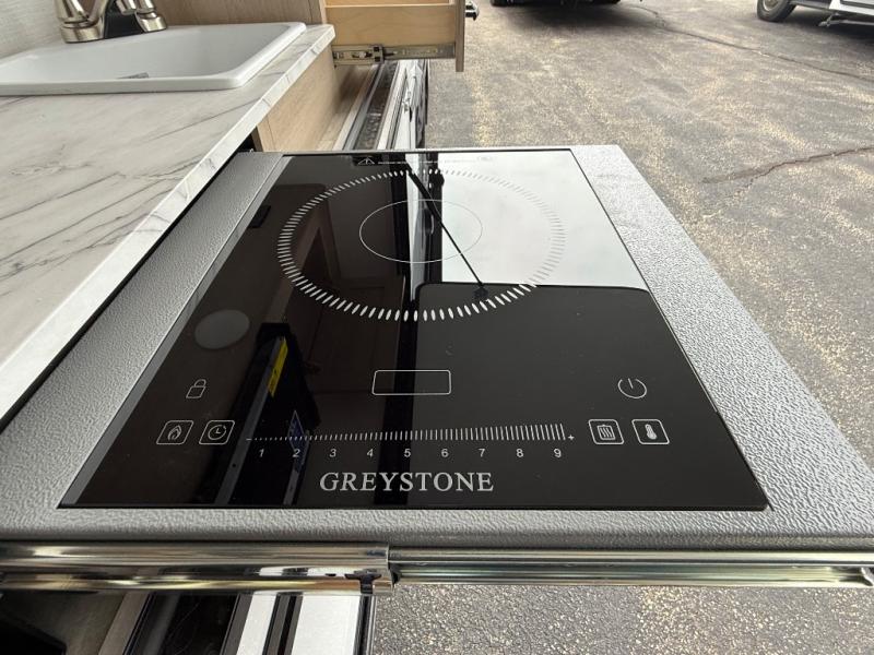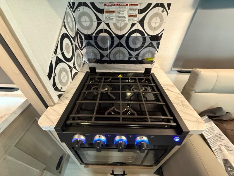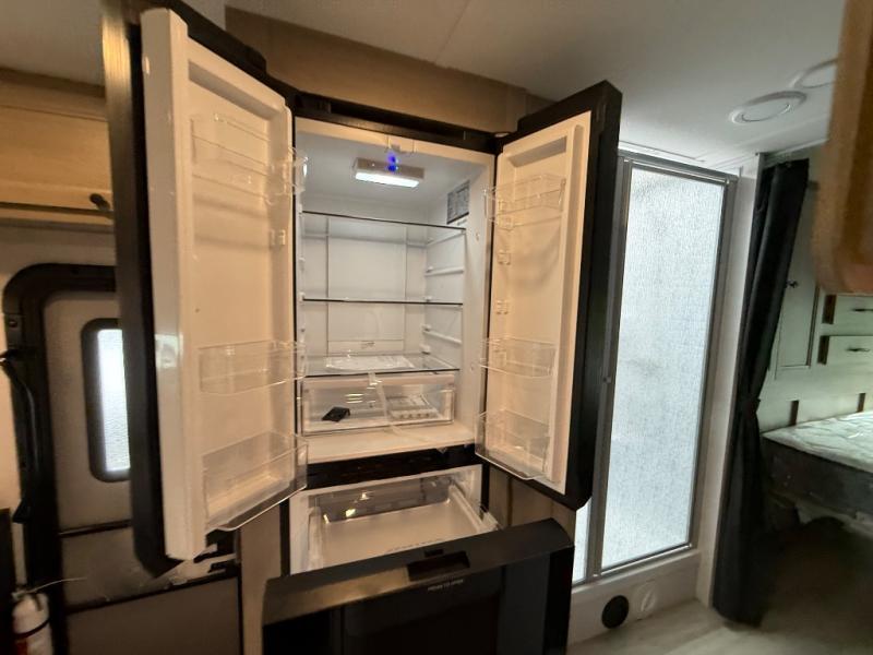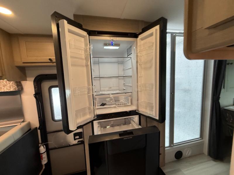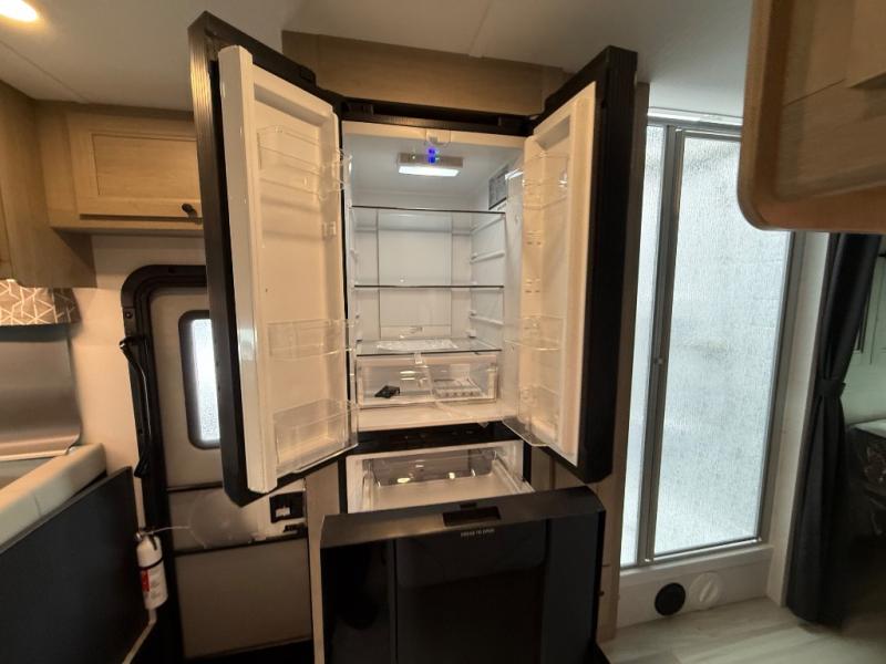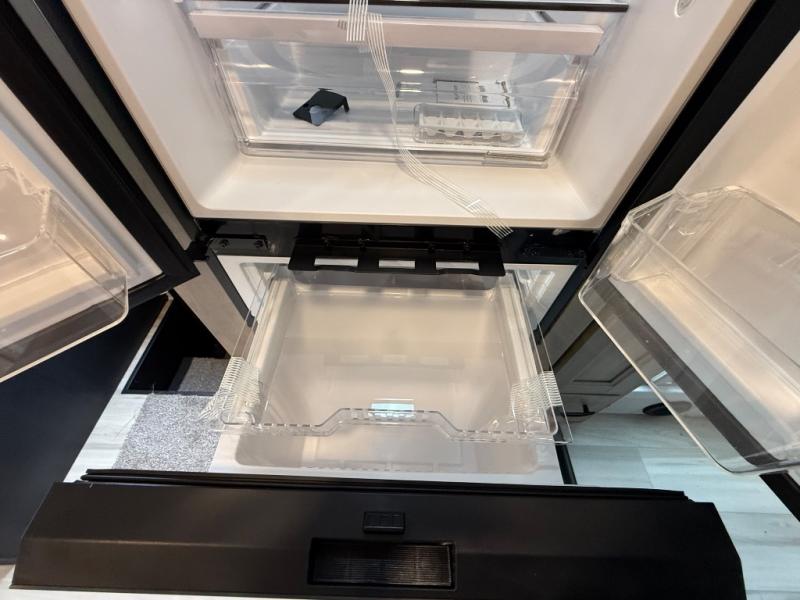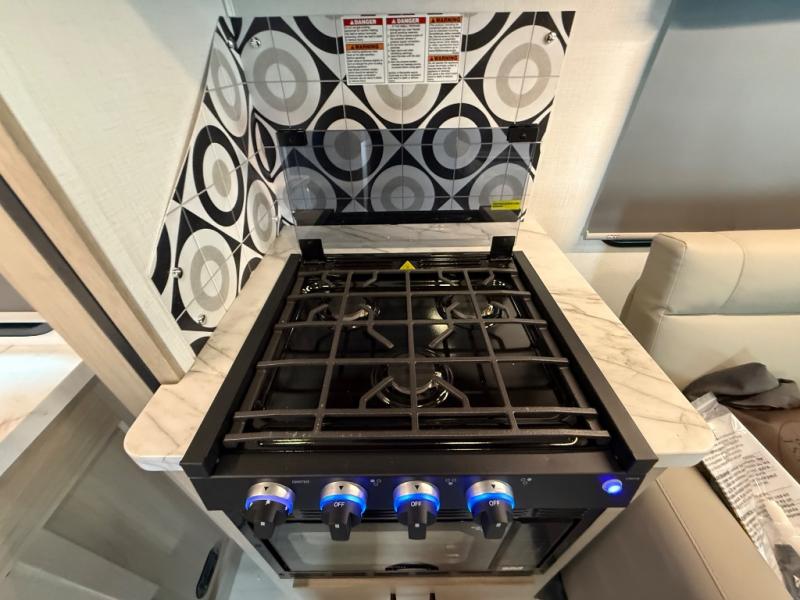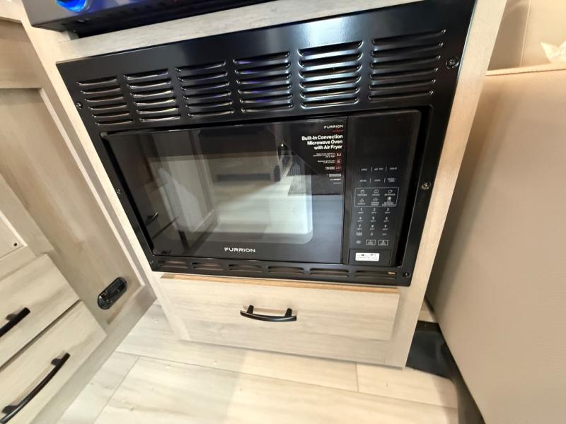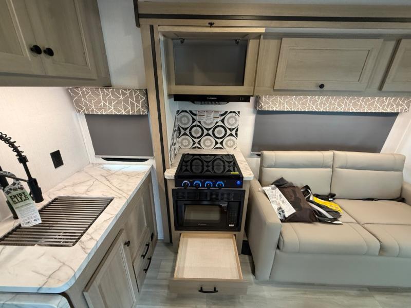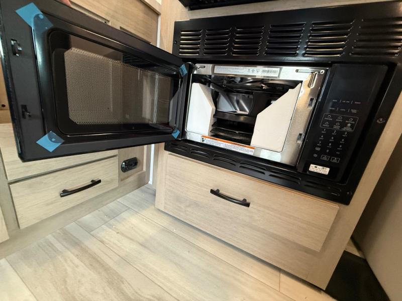 Kitchen: Equipped with a 12V residential-style refrigerator, 3-burner cooktop with glass cover, convection microwave, and ample counter space for meal preparation.