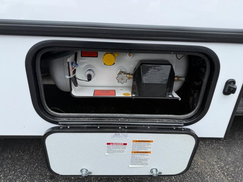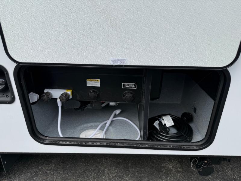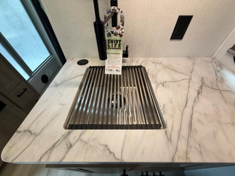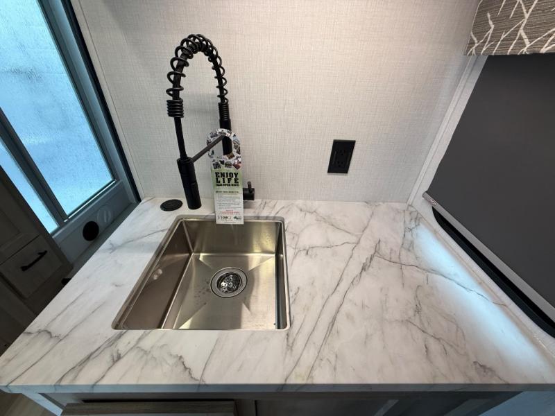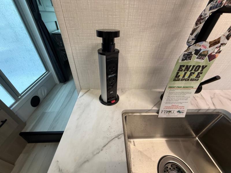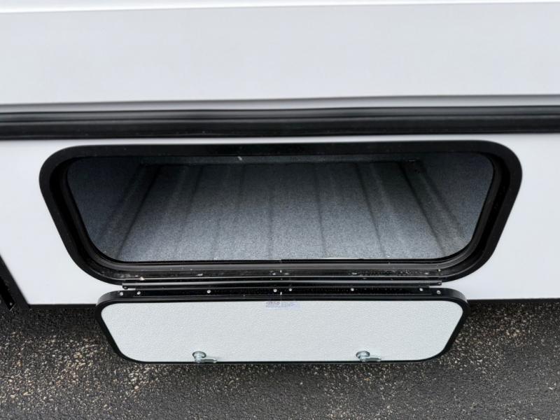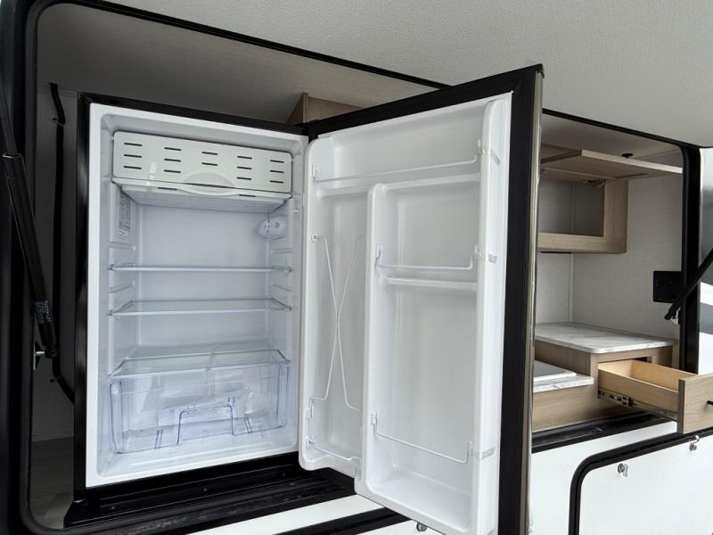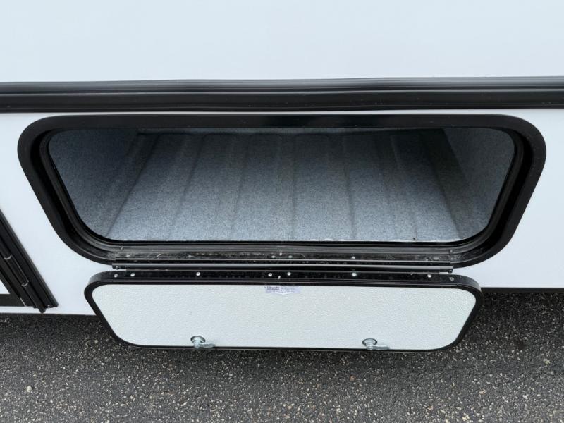 Exterior Amenities: Features an outside kitchen with a refrigerator and sink, a 16' power awning with LED lighting, and pass-through storage compartments for all your gear.