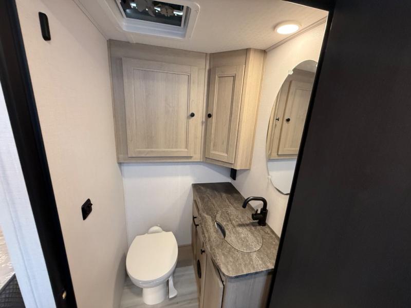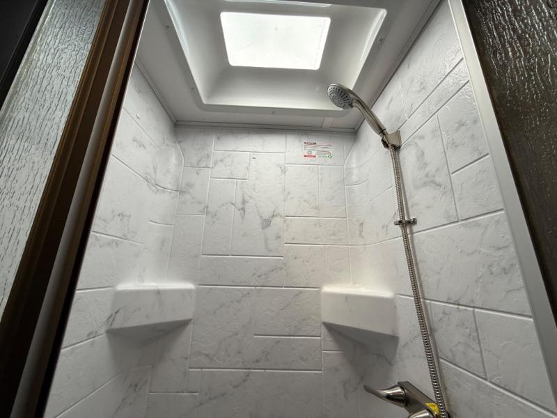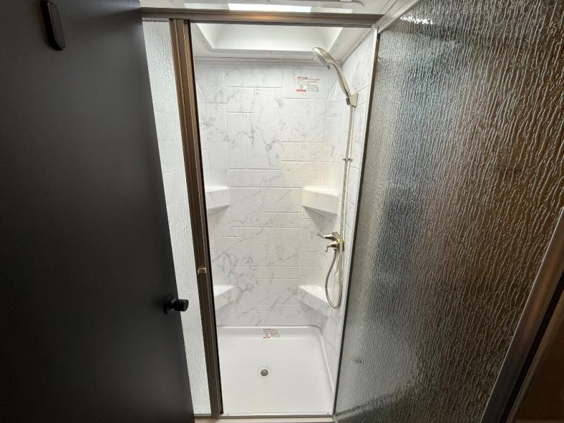 Bathroom: Offers a split bathroom layout with a 24" x 36" shower on one side and a toilet and vanity on the other, maximizing space and functionality.