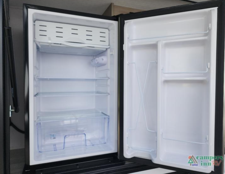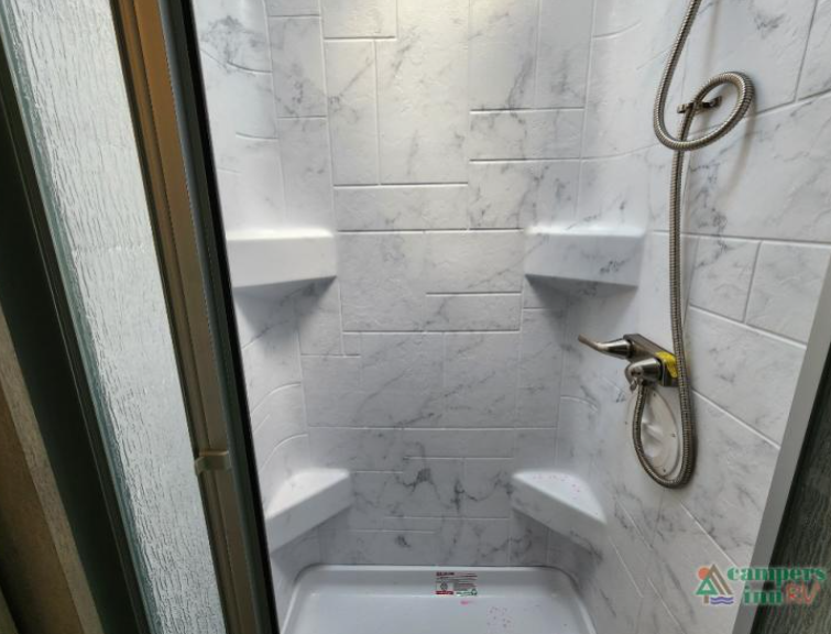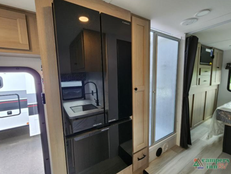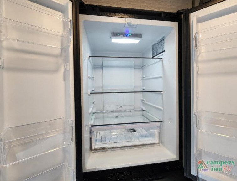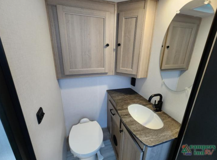 After a day full of adventure, unwind in your own private retreat featuring an RV queen bed slide for extra room, dual nightstands, and ample overhead storage. The split bathroom design gives you a residential feel with a 24" x 36" shower on one side and a private lavatory and vanity on the other, so two people can get ready without waiting in line.