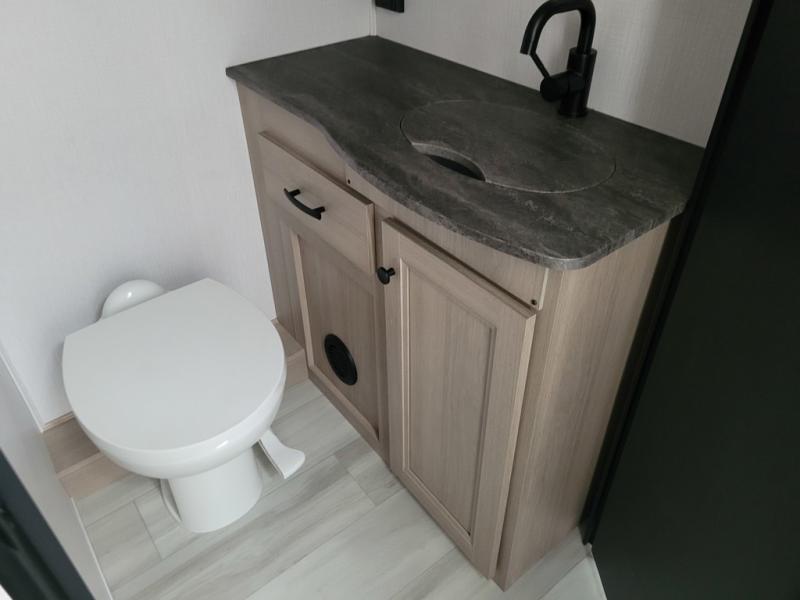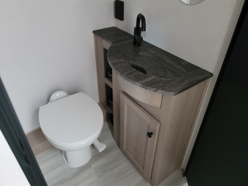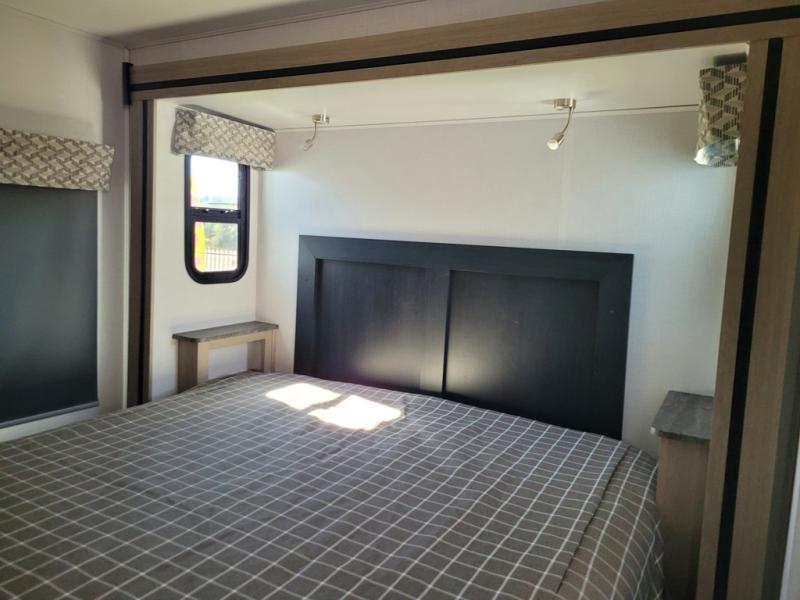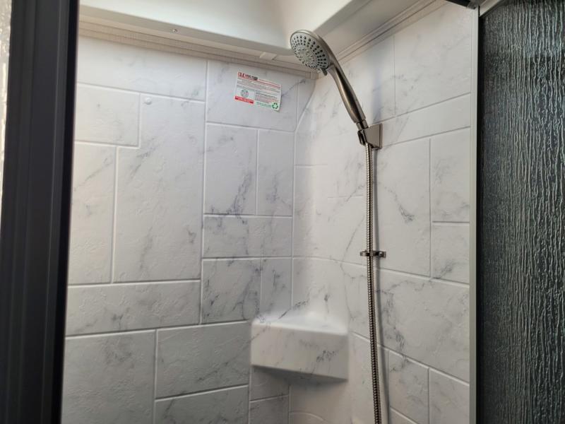 This motorhome has a rear private bedroom for you to sleep in each night, a sofa to rest on after you get home from mountain climbing, a split-style bathroom to clean up in each morning, and a complete kitchen to cook in when you're hungry. The RV queen bed, U-shaped dinette, sofa, and 60" x 80" bunk over the cab give you plenty of space to sleep eight people, and you can switch out the sofa for the optional power theater seating if you would like. Two slides add more space to this coach, and a 10.7-cubic foot refrigerator can hold lots of food.