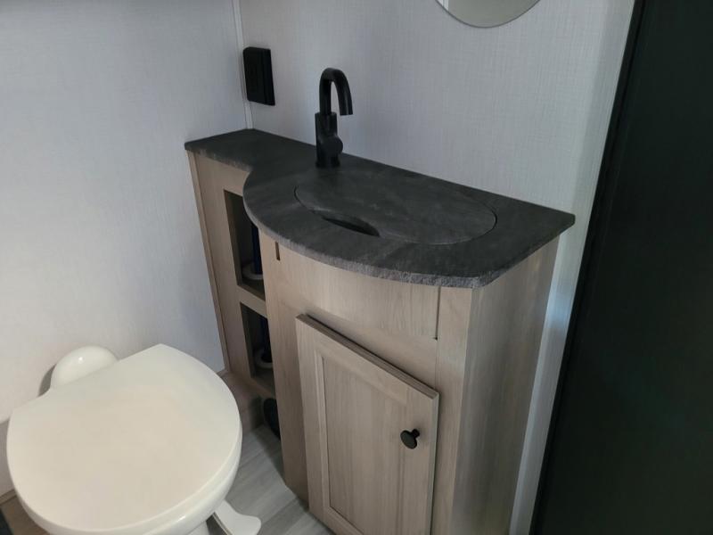 This motorhome has a rear private bedroom for you to sleep in each night, a sofa to rest on after you get home from mountain climbing, a split-style bathroom to clean up in each morning, and a complete kitchen to cook in when you're hungry. The RV queen bed, U-shaped dinette, sofa, and 60" x 80" bunk over the cab give you plenty of space to sleep eight people, and you can switch out the sofa for the optional power theater seating if you would like. Two slides add more space to this coach, and a 10.7-cubic foot refrigerator can hold lots of food.
