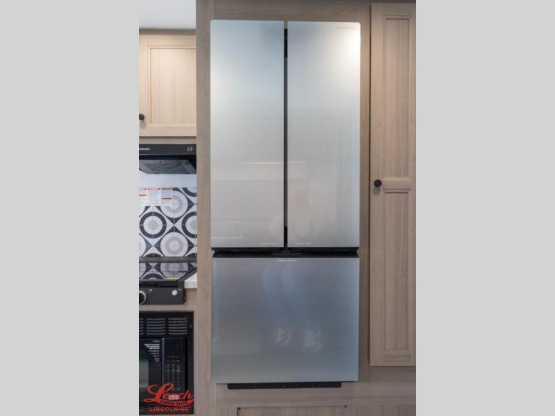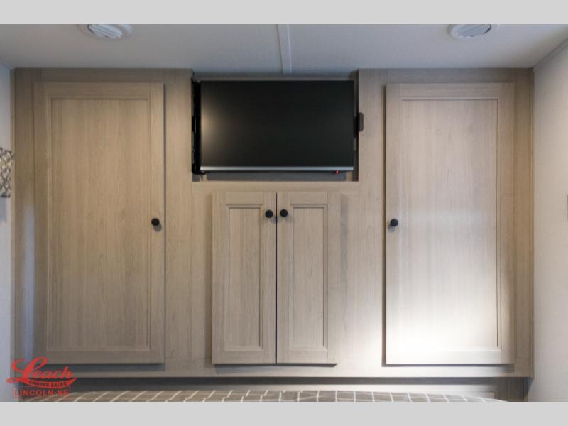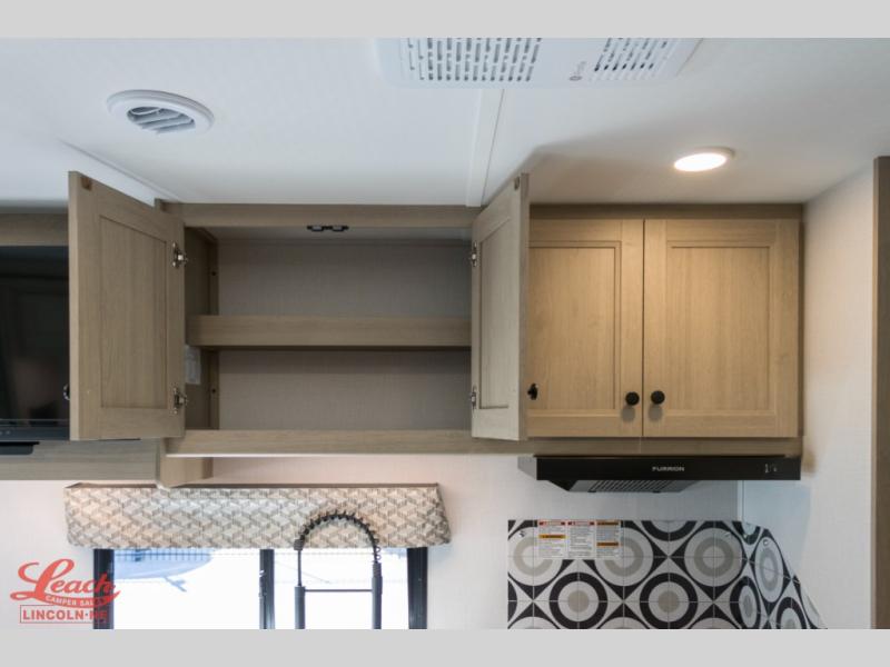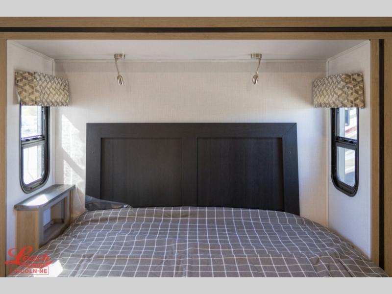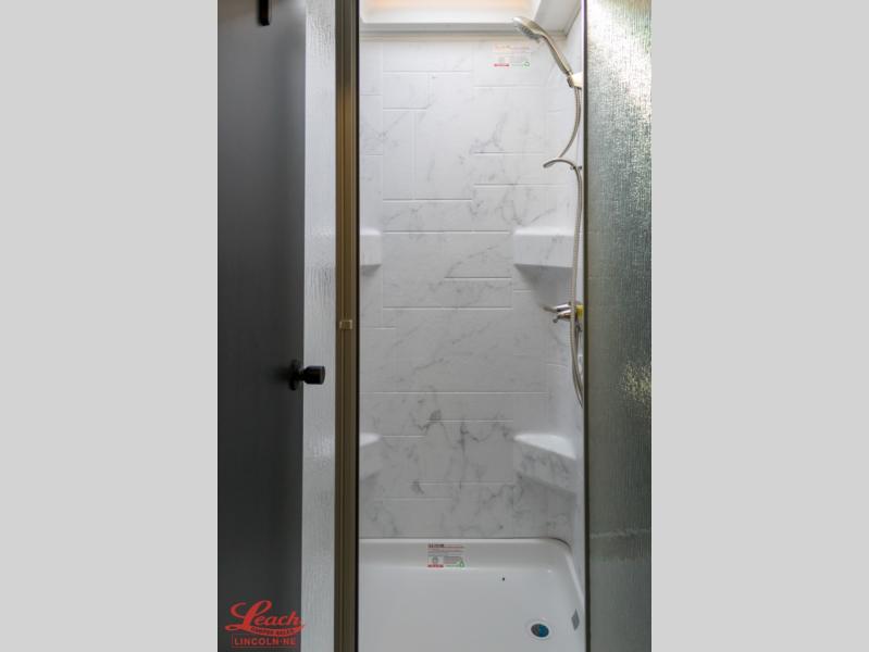This motorhome has a rear private bedroom for you to sleep in each night, a sofa to rest on after you get home from mountain climbing, a split-style bathroom to clean up in each morning, and a complete kitchen to cook in when you're hungry. The RV queen bed, U-shaped dinette, sofa, and 60" x 80" bunk over the cab give you plenty of space to sleep eight people, and you can switch out the sofa for the optional power theater seating if you would like. Two slides add more space to this coach, and a 10.7-cubic foot refrigerator can hold lots of food.