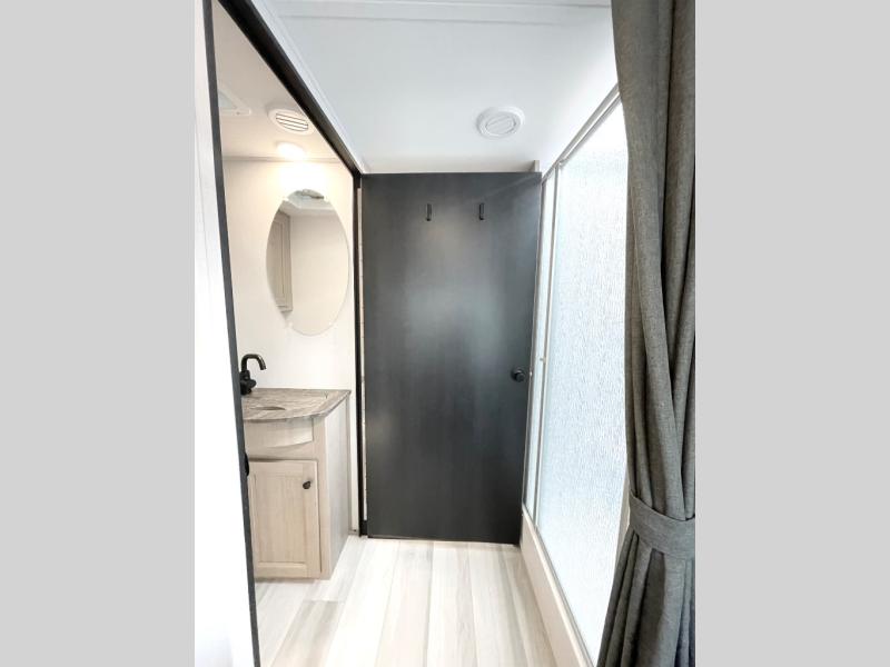 This motorhome has a rear private bedroom for you to sleep in each night, a sofa to rest on after you get home from mountain climbing, a split-style bathroom to clean up in each morning, and a complete kitchen to cook in when you're hungry. The RV queen bed, U-shaped dinette, sofa, and 60" x 80" bunk over the cab give you plenty of space to sleep eight people, and you can switch out the sofa for the optional power theater seating if you would like. Two slides add more space to this coach, and a 10.7-cubic foot refrigerator can hold lots of food.