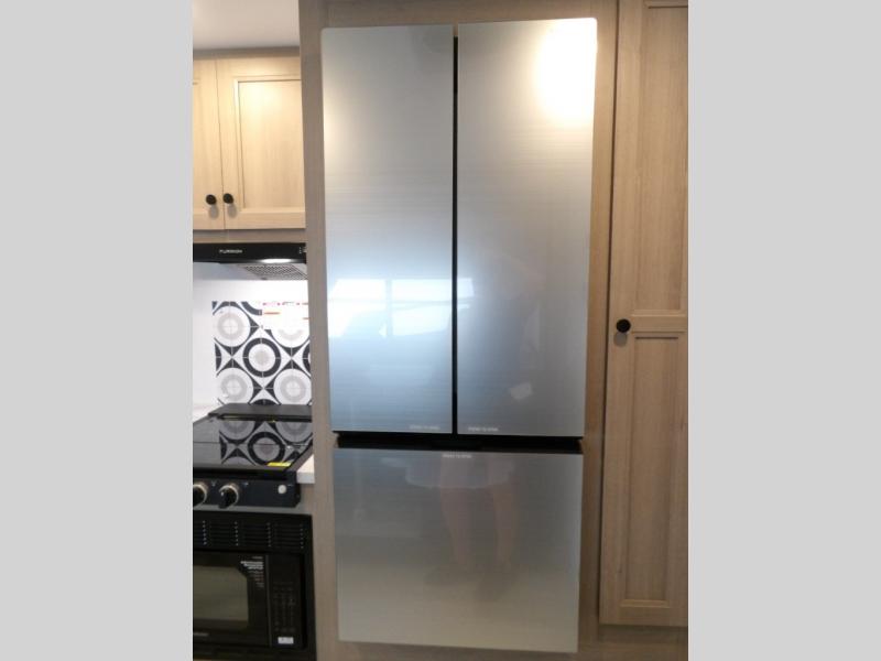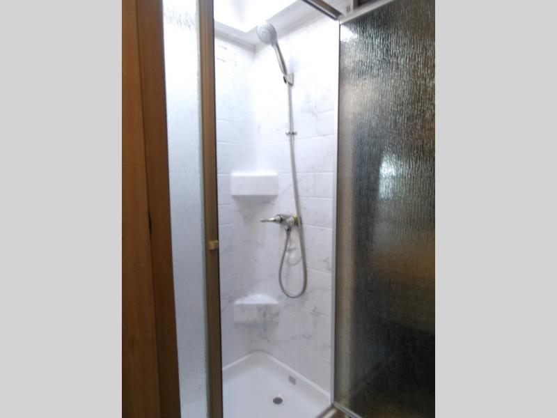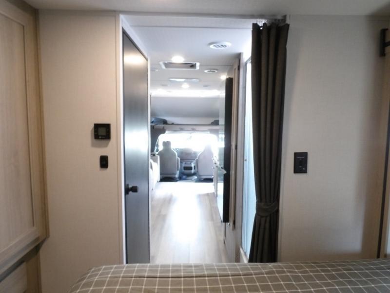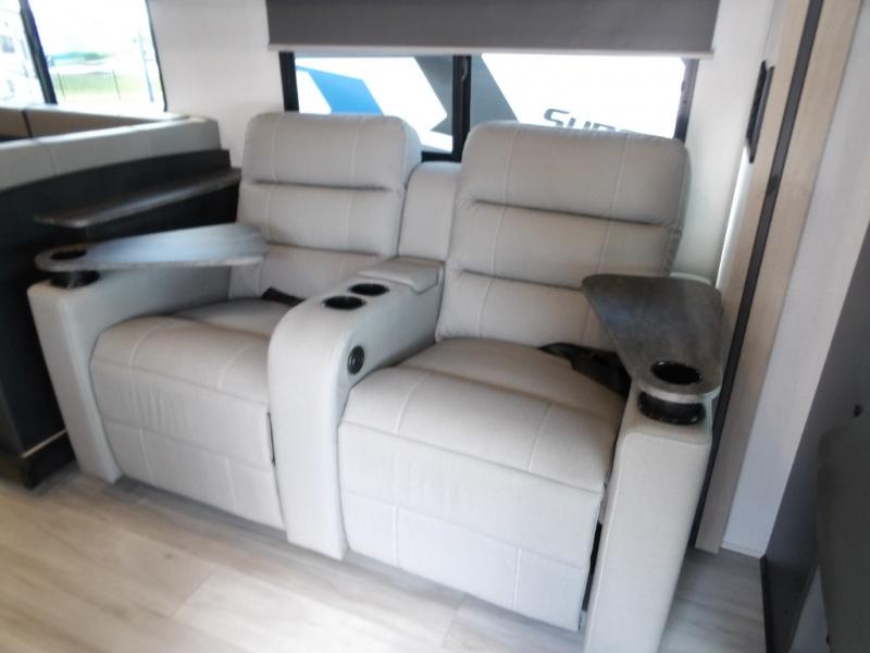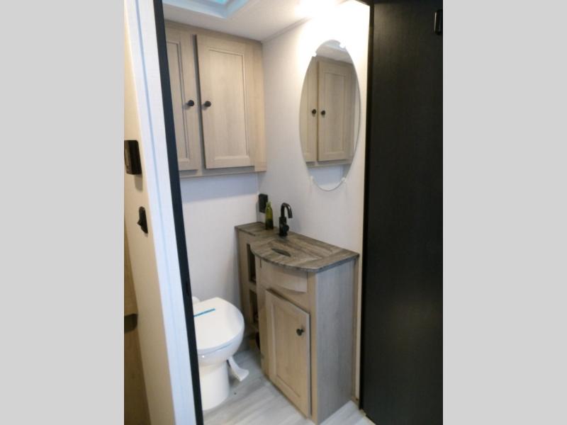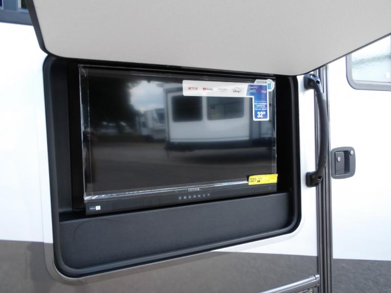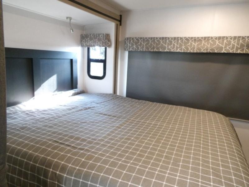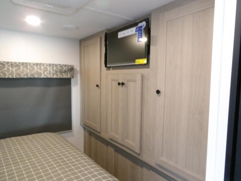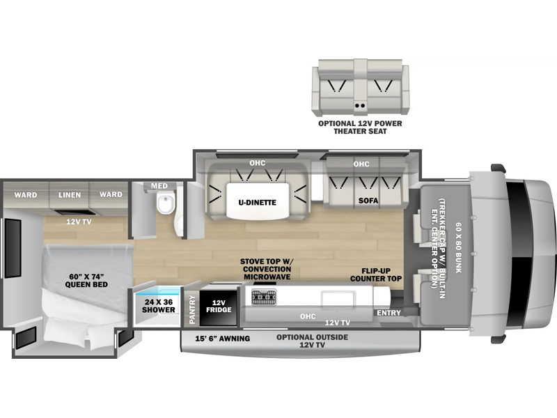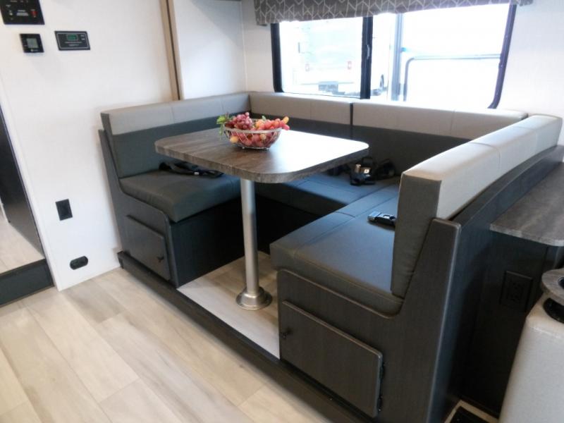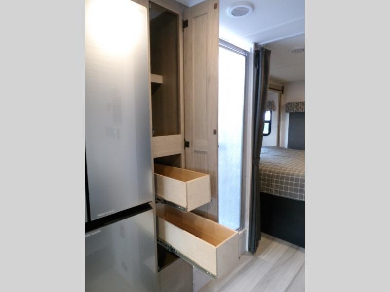 The 3010DS has a queen bedroom with slideout that includes a 60" x 74" bed, storage wall with two wardrobes, large drawers, and 12V TV. The split bathroom maximizes space without sacrificing amenities. There is a slideout that with a U-dinette and sofa (or optional theater seating). There's a pantry, 12V refrigerator, cooktop, convection microwave, plus a flip-up countertop extension for an extra surface. A 60" x 80" cab over bunk gives you an extra sleeping area and/or extra storage
