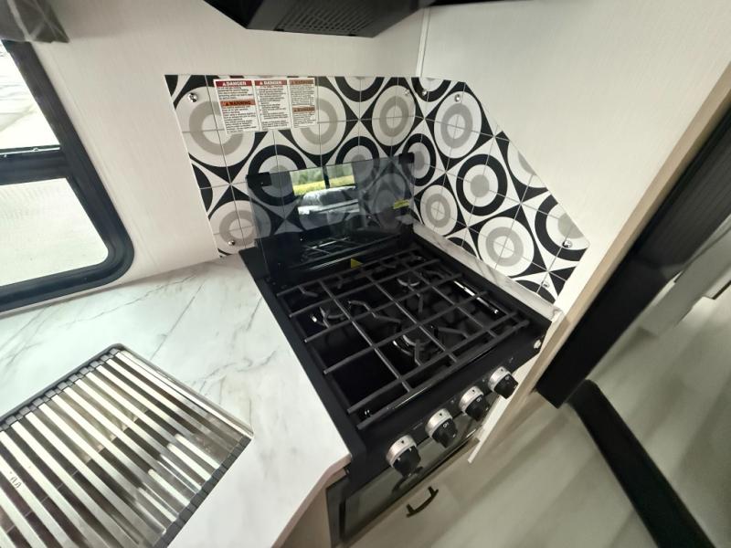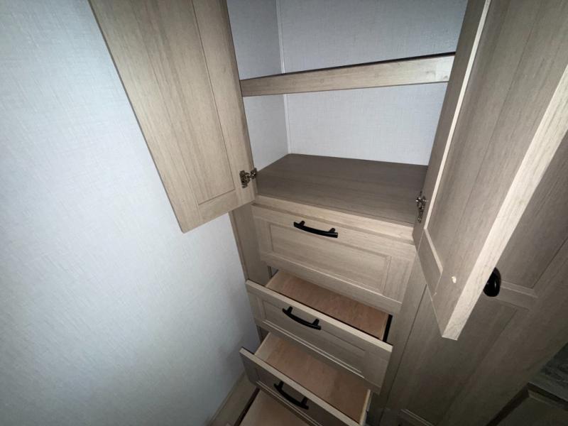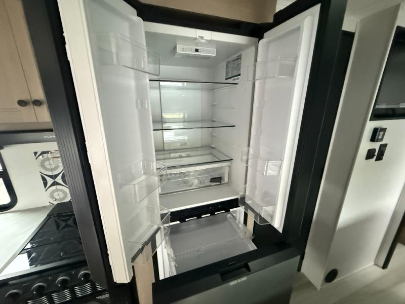 A lot of convenience has been packed into this coach with the full rear bathroom, the master suite, a complete kitchen, two TVs, and a bunk above the cab. An added bonus is the U-shaped dinette which can serve as a dining space or sleeping space depending on how you have it set up. If you don't need the bunk above cab for sleeping space, you could change it out for the optional Trekker cap with built-in entertainment center and storage. The kitchen is equipped with all of your favorites: a pantry, a convection microwave, a three-burner range, a flip-up countertop, and a 10.7-cubic foot refrigerator.