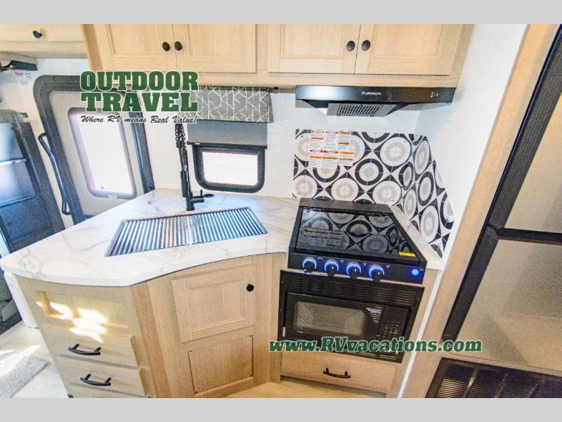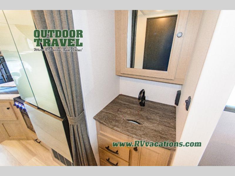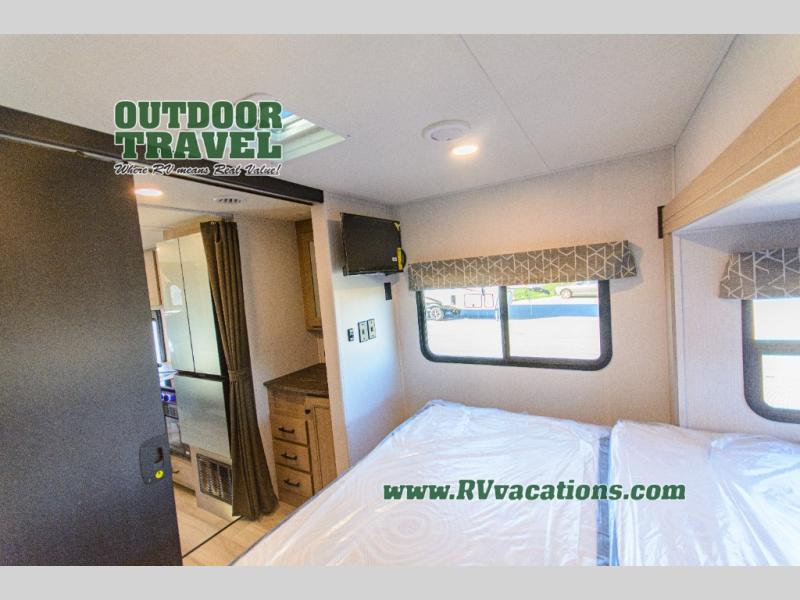 This Sunseeker Classic Class C gas motorhome has a rear private bedroom that holds the queen-size bed on a unique rear slide out. The bedroom also has its own 12V TV and wardrobe slide, so you have extra space without adding travel length. Another slide holds the U-shaped dinette out in the main living area, and you can watch the second LED TV out there. The bathroom has the toilet and 24" x 36" shower on one side of the coach and the medicine cabinet and sink on the other side so two people can freshen up at once. The kitchen has everything needed for a full weekend of delicious meals with the pantry, convection microwave, flip-up countertop, and 10.7-cubic foot refrigerator.