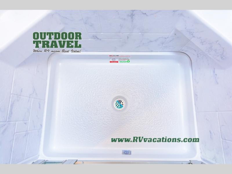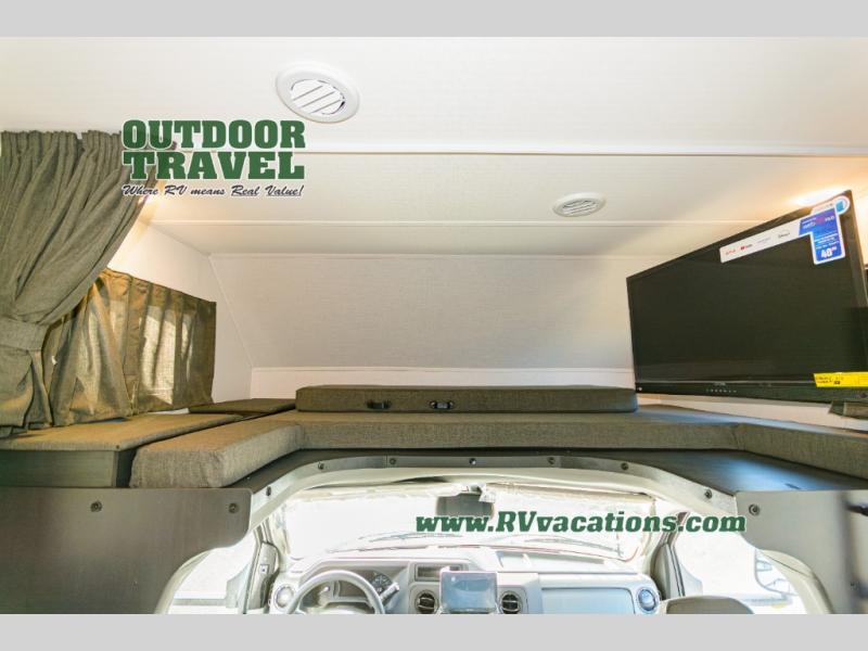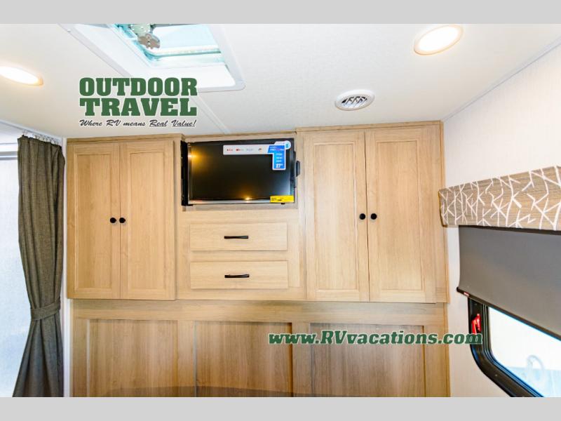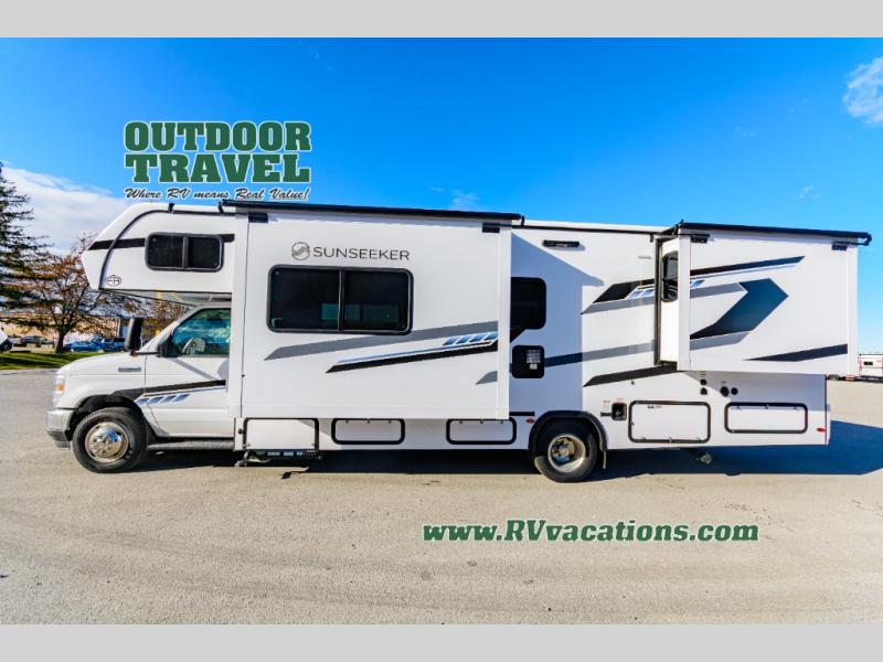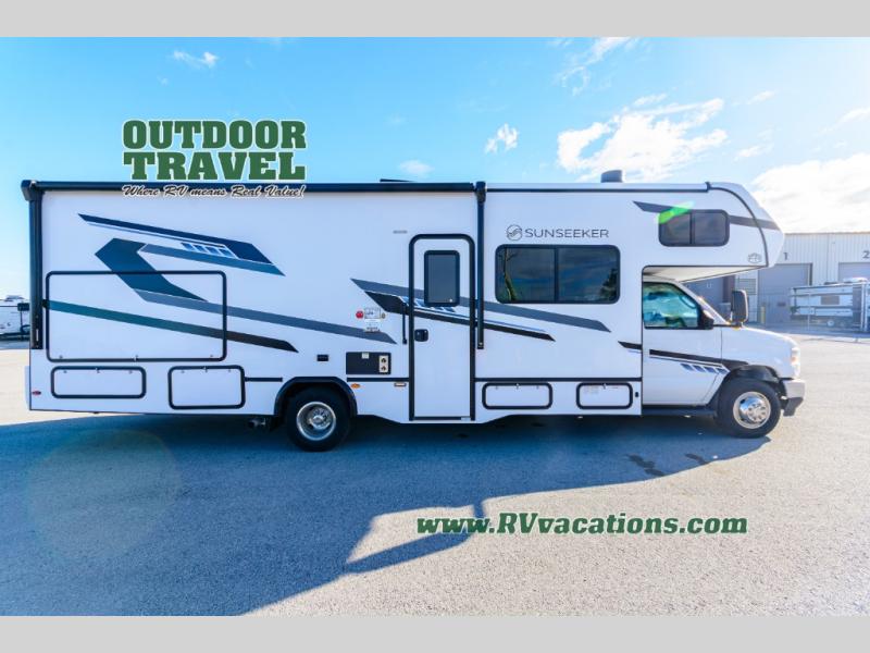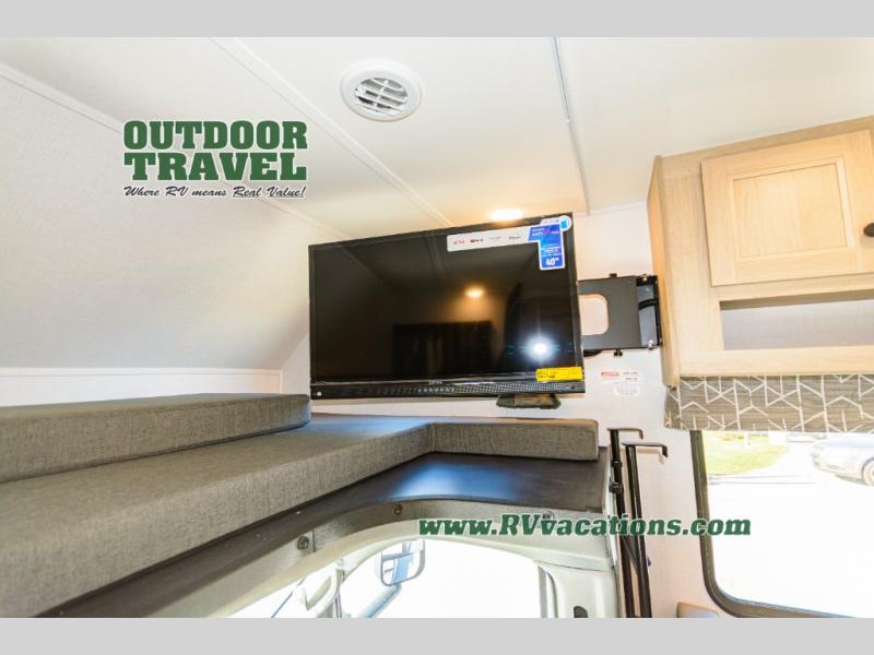 Grab your sunhat and your adventurous spirit and head out with this Sunseeker Classic Class C gas motorhome! There is a rear private bedroom to change your clothes and sleep soundly, and the RV queen bed slide adds more space to this area. The split-style bathroom has a 24" x 36" shower on one side of the coach while the lavatory and vanity stay secluded on the other side. If you don't need the extra sleeping space from the bunk over the cab, you can choose to add the optional Trekker cap with a built-in entertainment center and storage in its place. Sit back with a big bowl of cereal at the booth dinette, or get a little more comfortable on the sofa. You can also go outside to prepare some heartier food at the outdoor kitchen.