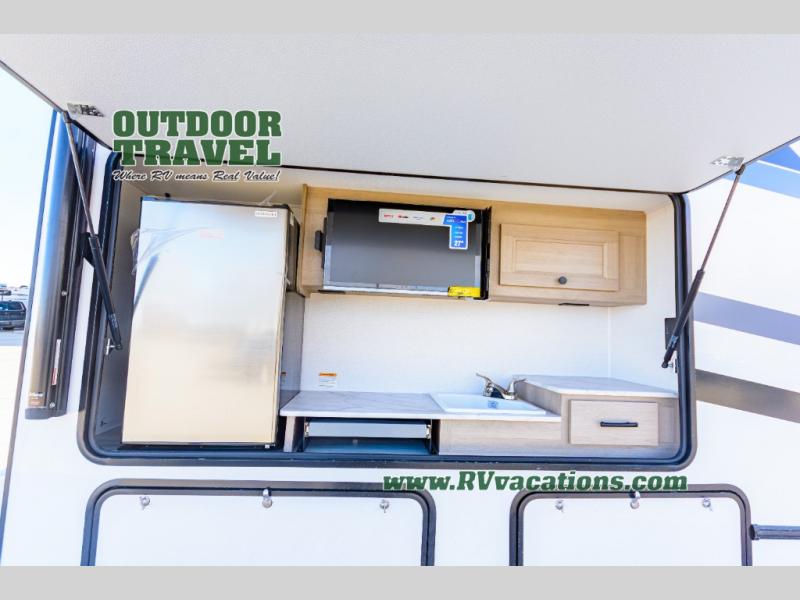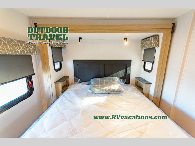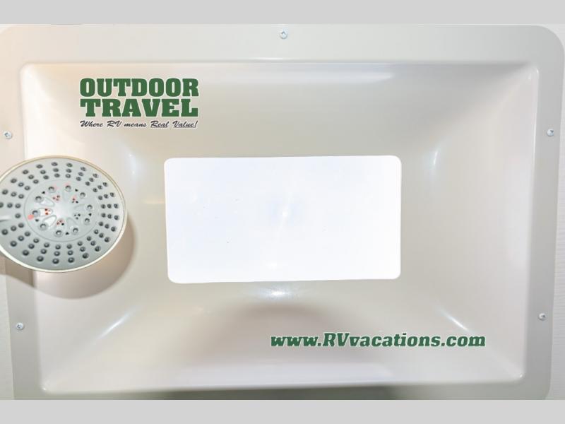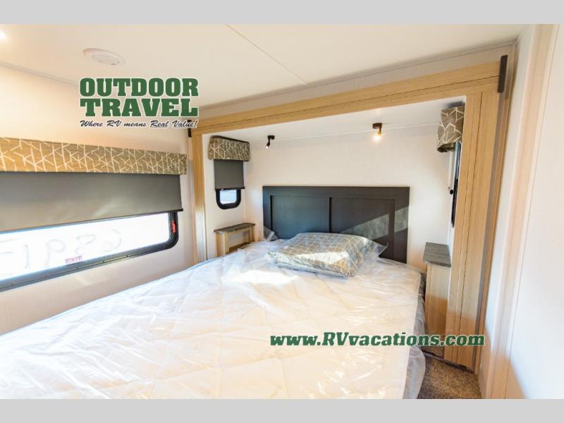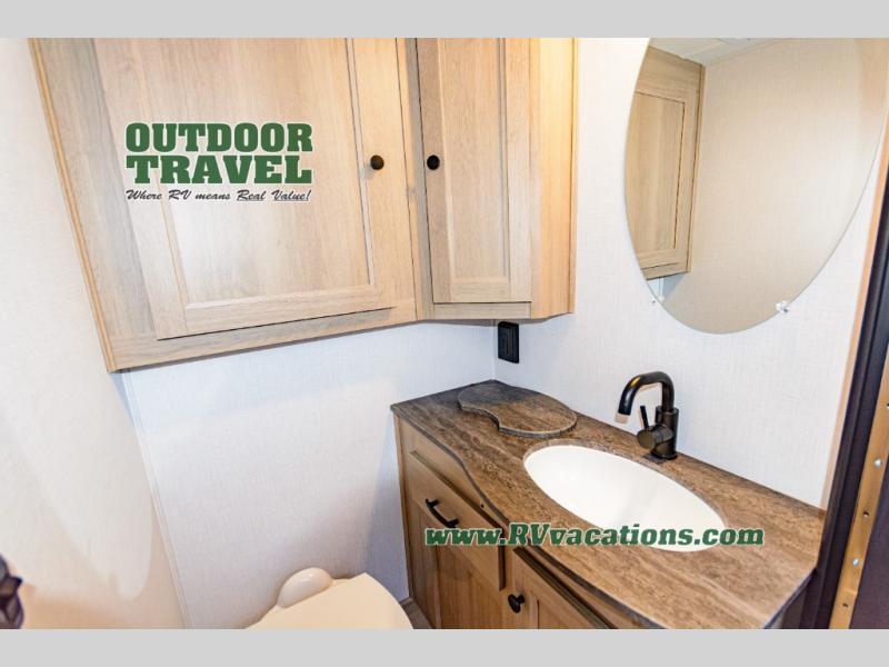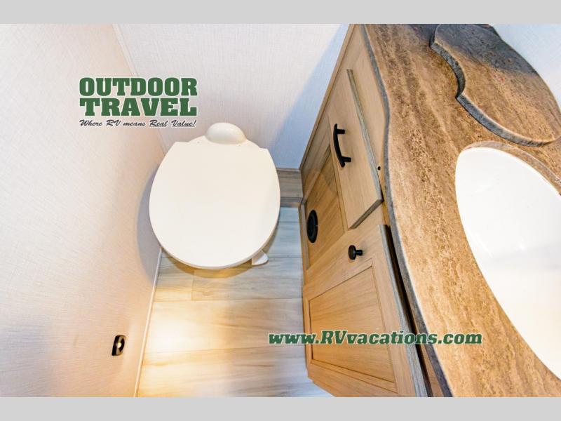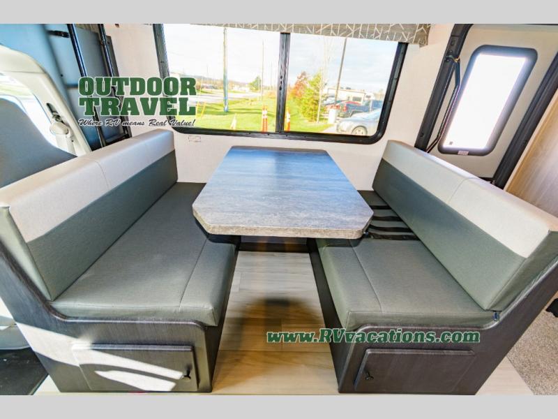 Grab your sunhat and your adventurous spirit and head out with this Sunseeker Classic Class C gas motorhome! There is a rear private bedroom to change your clothes and sleep soundly, and the RV queen bed slide adds more space to this area. The split-style bathroom has a 24" x 36" shower on one side of the coach while the lavatory and vanity stay secluded on the other side. If you don't need the extra sleeping space from the bunk over the cab, you can choose to add the optional Trekker cap with a built-in entertainment center and storage in its place. Sit back with a big bowl of cereal at the booth dinette, or get a little more comfortable on the sofa. You can also go outside to prepare some heartier food at the outdoor kitchen.