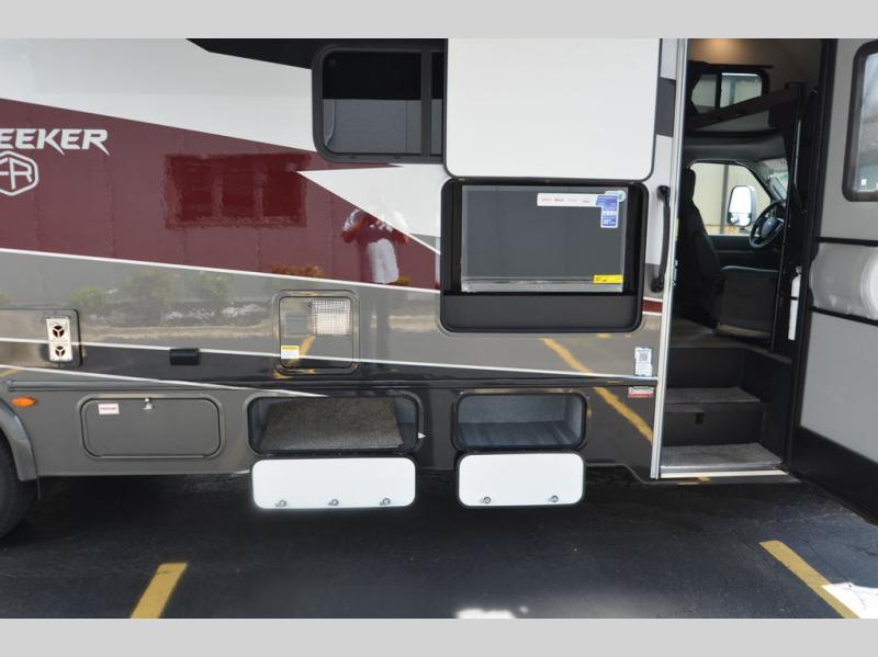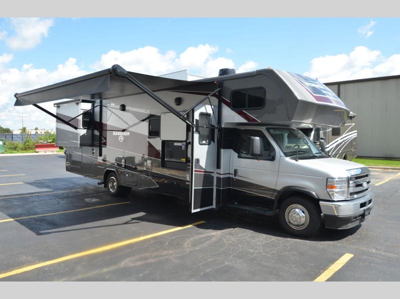 This Sunseeker Classic Class C gas motorhome has a rear private bedroom for you to sleep in each night, a sofa to rest on after you get home from mountain climbing, a split-style bathroom to clean up in each morning, and a complete kitchen to cook in when you're hungry. The RV queen bed, U-shaped dinette, sofa, and 60" x 80" bunk over the cab give you plenty of space to sleep eight people, and you can switch out the sofa for the optional power theater seating if you would like. Two slides add more space to this coach, and a 10.7-cubic foot refrigerator can hold lots of food.