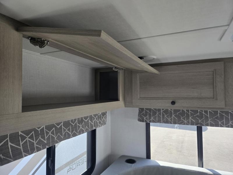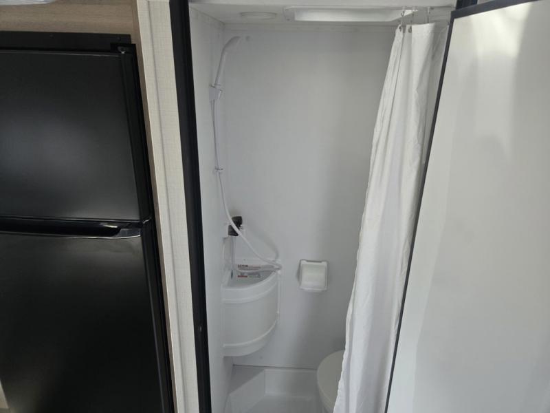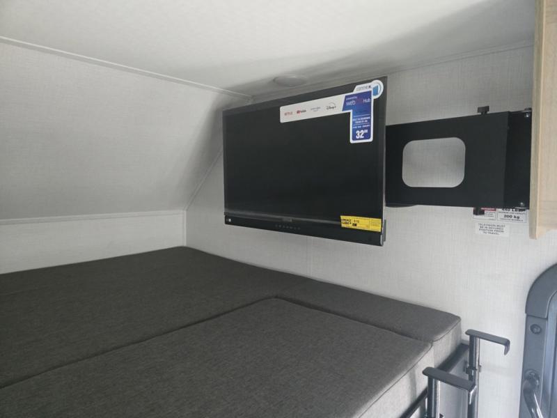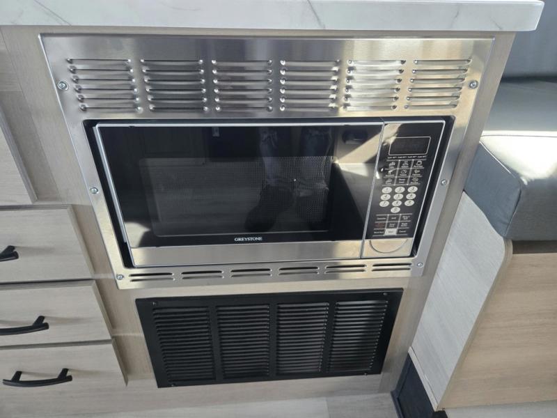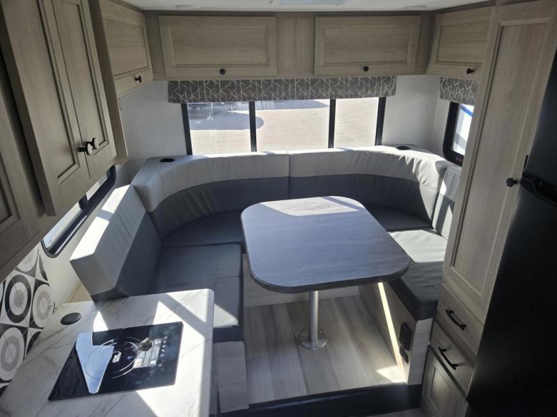 Upon entering this unit, you’re greeted by a spacious 60" x 80" cab-over bunk, providing plenty of comfortable sleeping space for family or guests. Near the entrance, a swing-arm 12V TV lets you enjoy your favorite shows and movies while on the road. Moving toward the center, you’ll find a pantry and a 10.7 cu. ft. refrigerator, perfect for storing both fresh groceries and dry goods. Adjacent to it is the well-designed wet bath, equipped with an oxygen-infused showerhead and flexible extension for a refreshing experience, complemented by a shower skylight and electric roof fan for added light and ventilation. Across the way, the kitchen comes fully equipped with a recessed two-burner range and flush glass cover, a convection microwave/air fryer, and a flip-up countertop that expands your workspace, making meal prep easy and efficient. At the rear, the inviting U-shaped dinette offers a cozy spot to relax, dine, or gather with friends, and at night, it effortlessly converts into an additional sleeping area so you can rest in complete comfort.