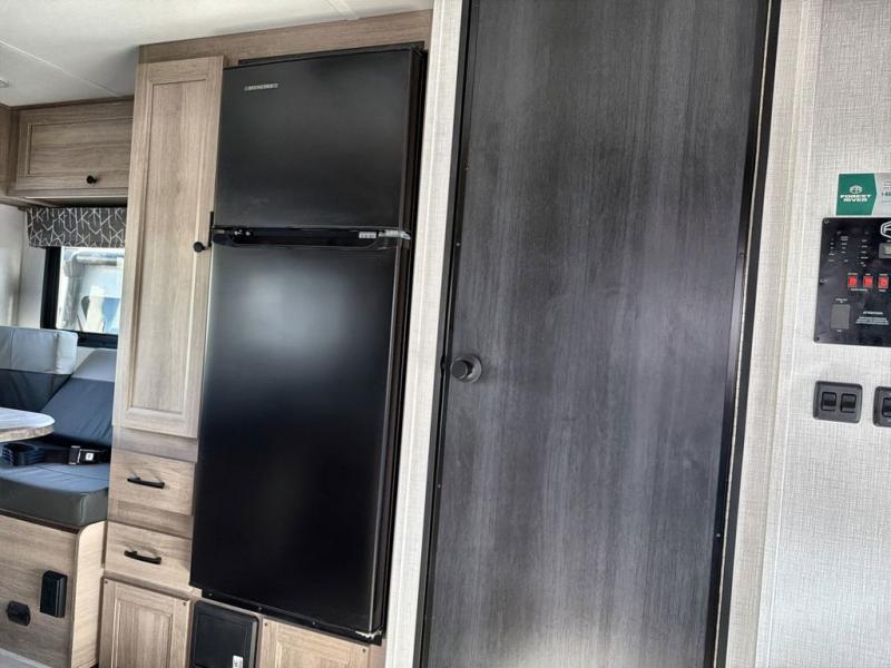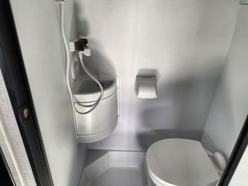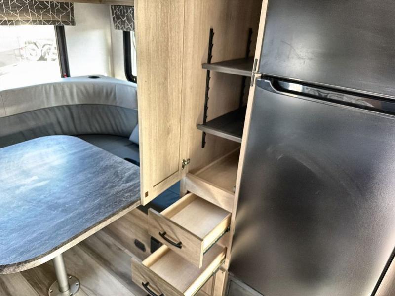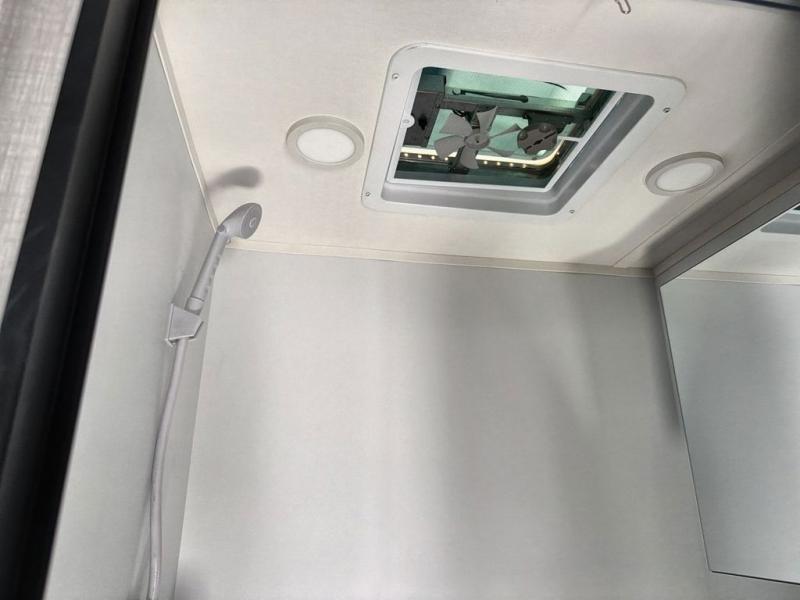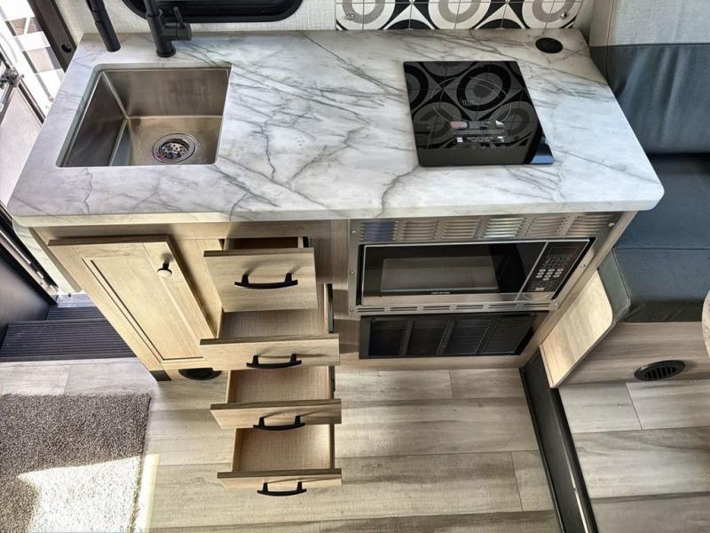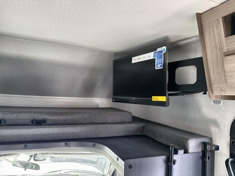 Upon entering this unit, you’re greeted by a spacious 60" x 80" cab-over bunk, providing plenty of comfortable sleeping space for family or guests. Near the entrance, a swing-arm 12V TV lets you enjoy your favorite shows and movies while on the road. Moving toward the center, you’ll find a pantry and a 10.7 cu. ft. refrigerator, perfect for storing both fresh groceries and dry goods. Adjacent to it is the well-designed wet bath, equipped with an oxygen-infused showerhead and flexible extension for a refreshing experience, complemented by a shower skylight and electric roof fan for added light and ventilation. Across the way, the kitchen comes fully equipped with a recessed two-burner range and flush glass cover, a convection microwave/air fryer, and a flip-up countertop that expands your workspace, making meal prep easy and efficient. At the rear, the inviting U-shaped dinette offers a cozy spot to relax, dine, or gather with friends, and at night, it effortlessly converts into an additional sleeping area so you can rest in complete comfort.