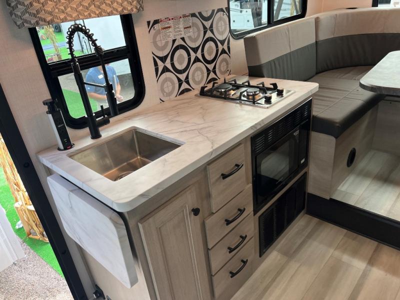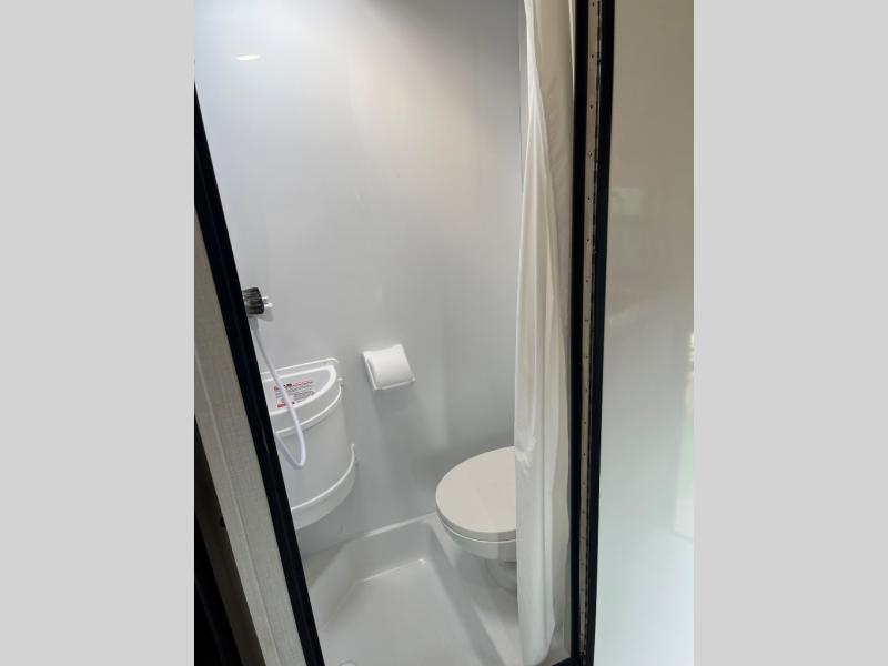 Upon entering this unit, you’re greeted by a spacious 60" x 80" cab-over bunk, providing plenty of comfortable sleeping space for family or guests. Near the entrance, a swing-arm 12V TV lets you enjoy your favorite shows and movies while on the road. Moving toward the center, you’ll find a pantry and a 10.7 cu. ft. refrigerator, perfect for storing both fresh groceries and dry goods. Adjacent to it is the well-designed wet bath, equipped with an oxygen-infused showerhead and flexible extension for a refreshing experience, complemented by a shower skylight and electric roof fan for added light and ventilation. Across the way, the kitchen comes fully equipped with a recessed two-burner range and flush glass cover, a convection microwave/air fryer, and a flip-up countertop that expands your workspace, making meal prep easy and efficient. At the rear, the inviting U-shaped dinette offers a cozy spot to relax, dine, or gather with friends, and at night, it effortlessly converts into an additional sleeping area so you can rest in complete comfort.