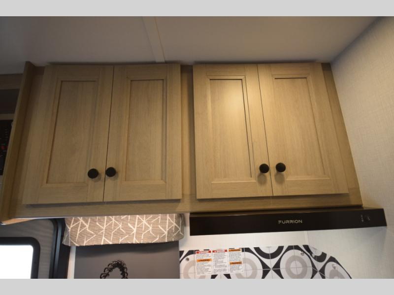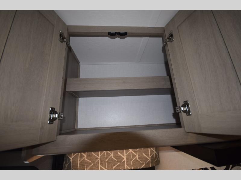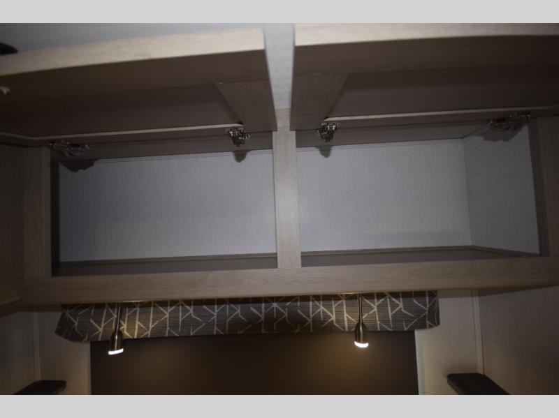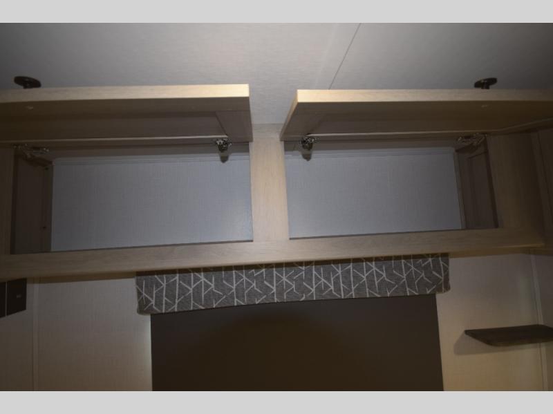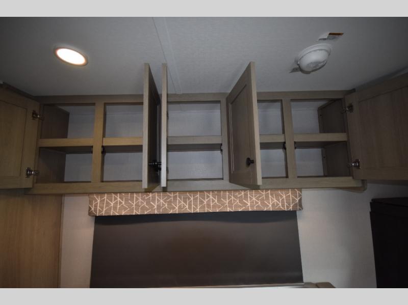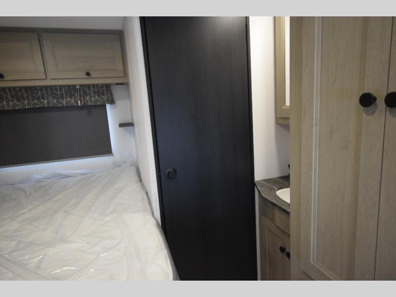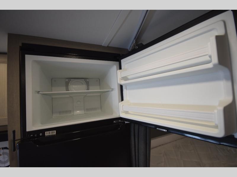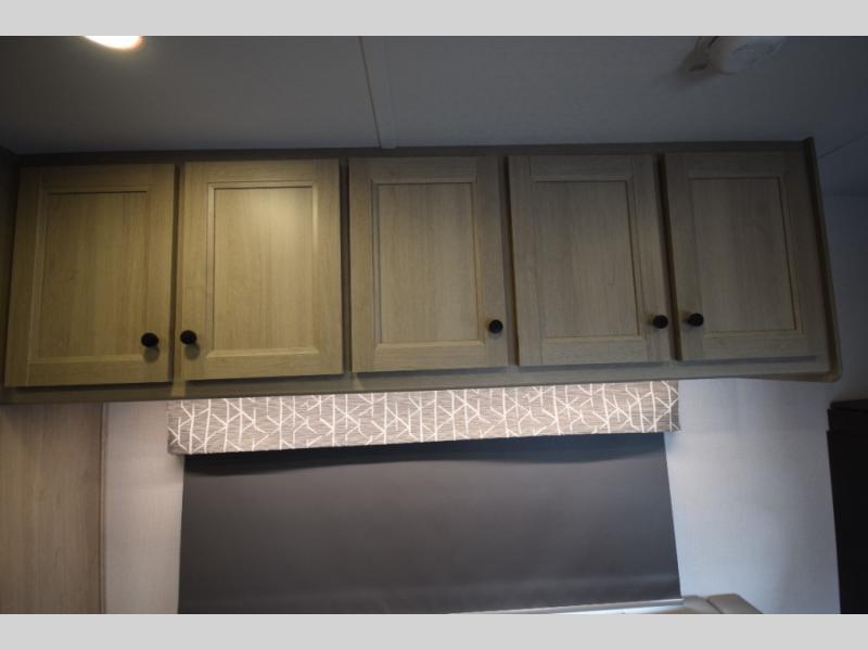 Up front, the cab-over bunk provides a roomy and convenient bed for kids or guests, while the rear queen bed gives you a cozy, semi-private sleeping area, complete with a privacy curtain and easy access to the full bathroom—creating a practical master suite feel.