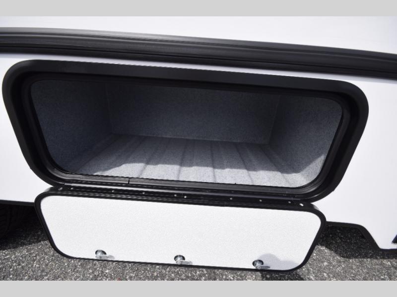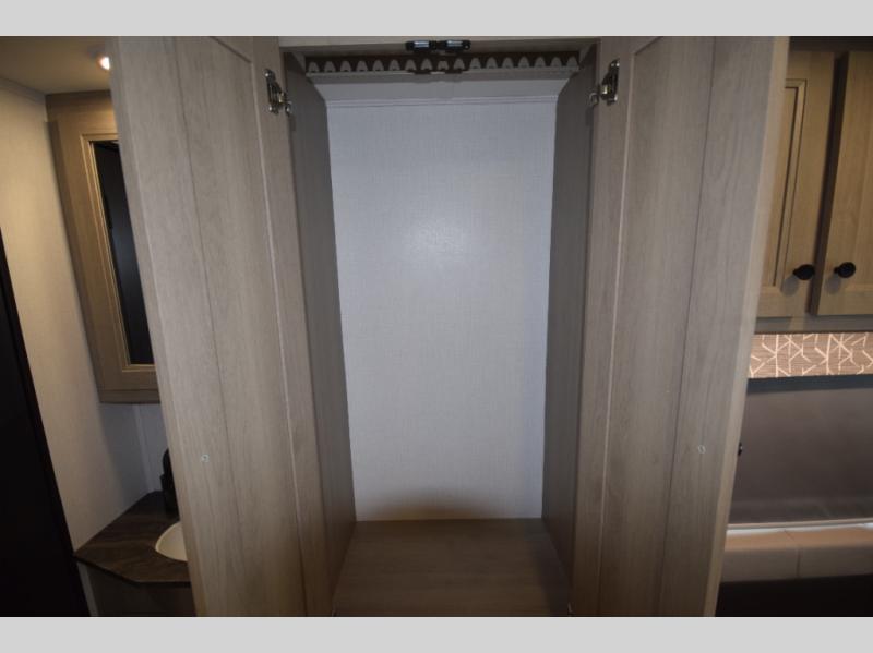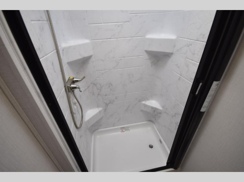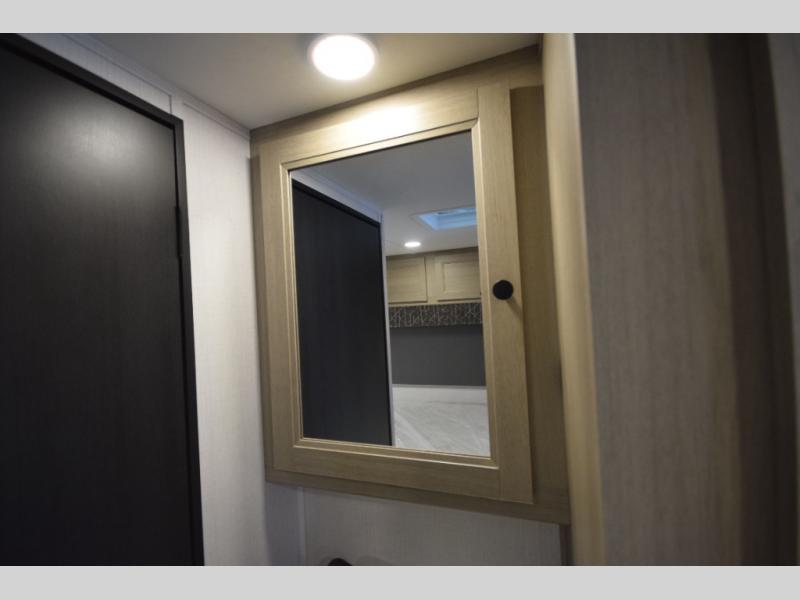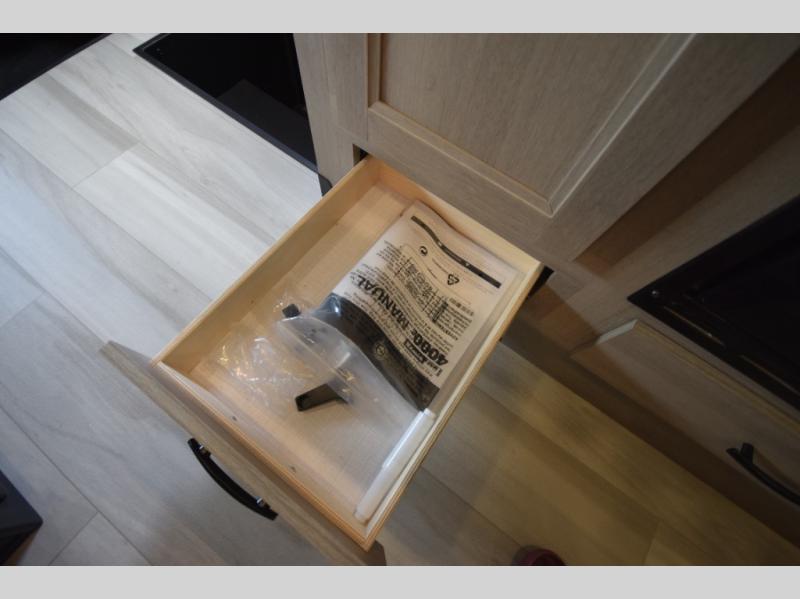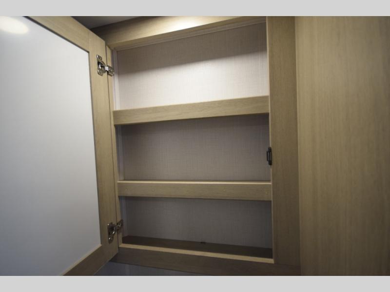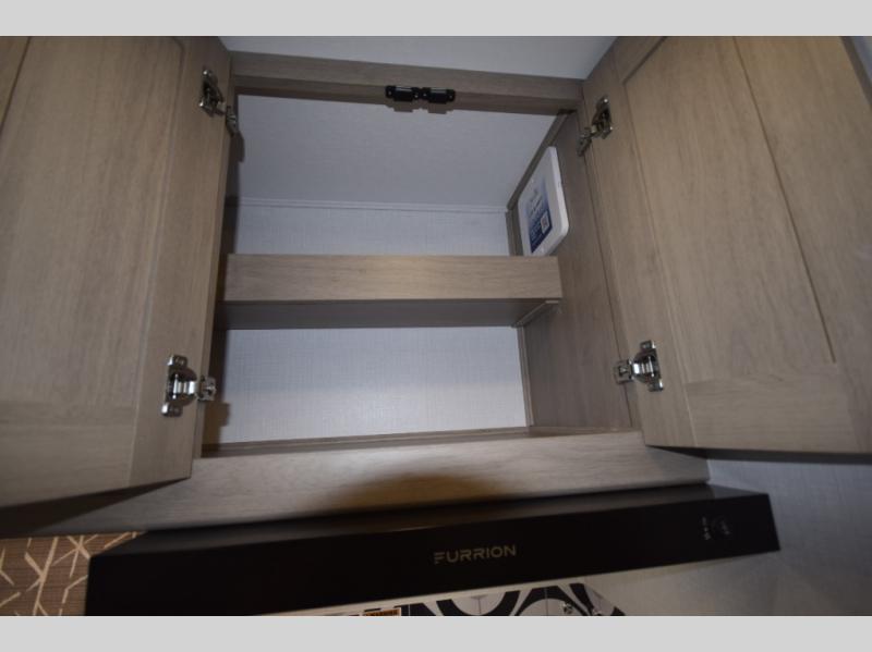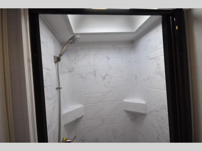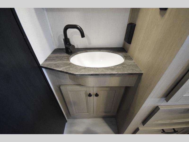 Up front, the cab-over bunk provides a roomy and convenient bed for kids or guests, while the rear queen bed gives you a cozy, semi-private sleeping area, complete with a privacy curtain and easy access to the full bathroom—creating a practical master suite feel.