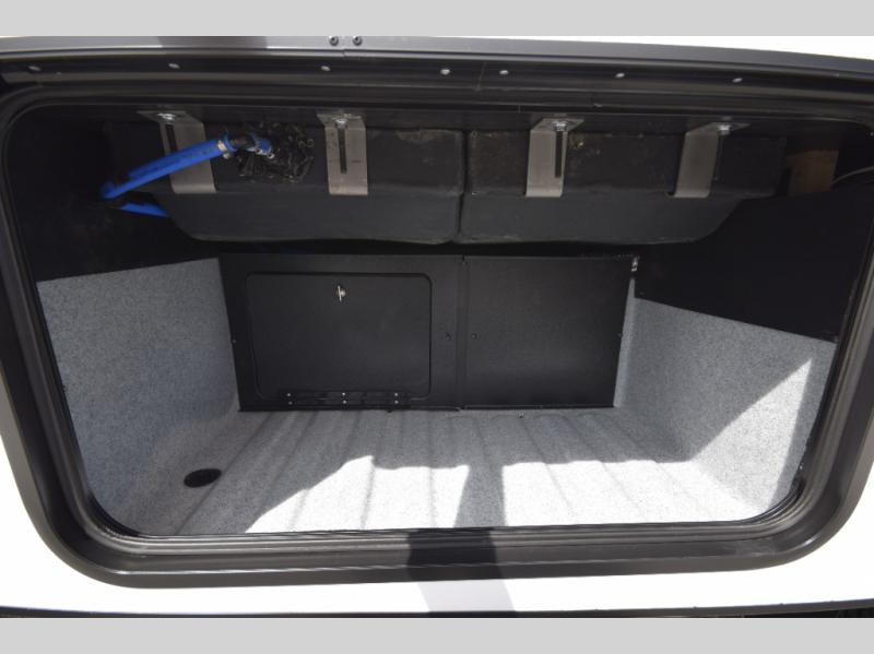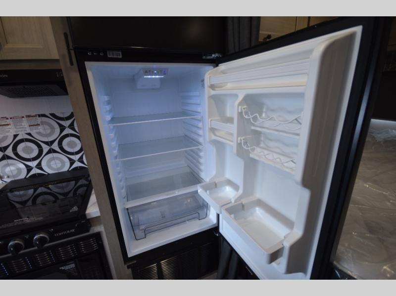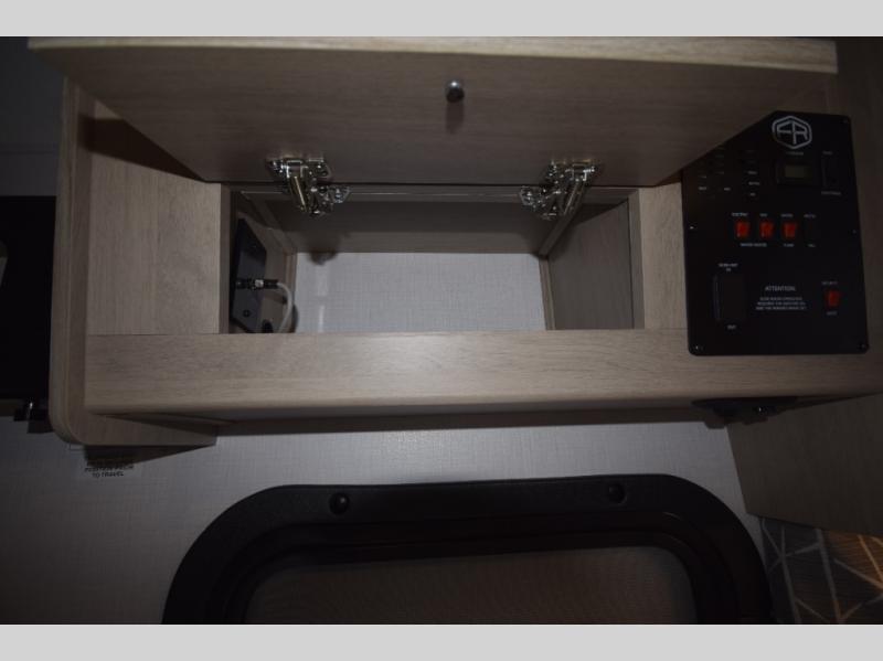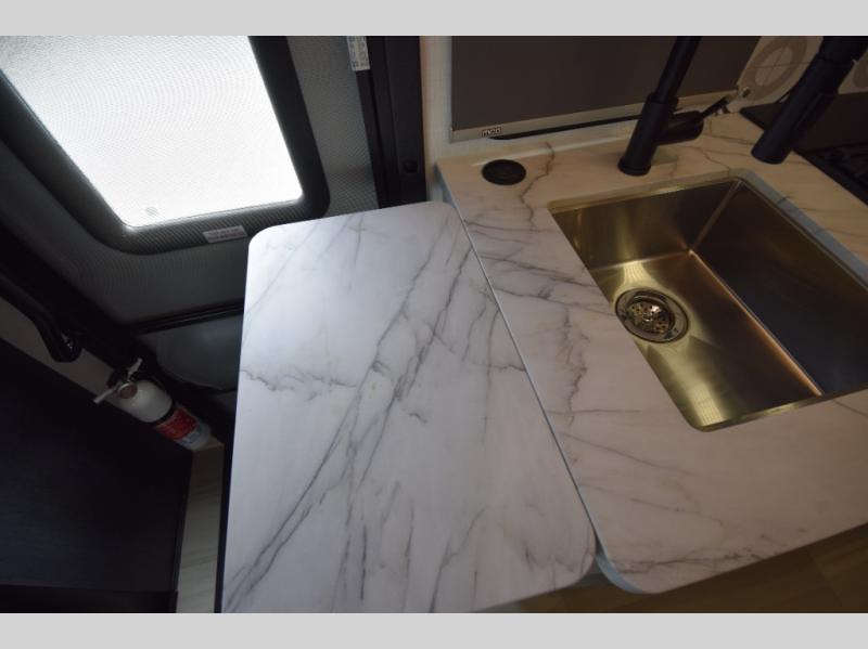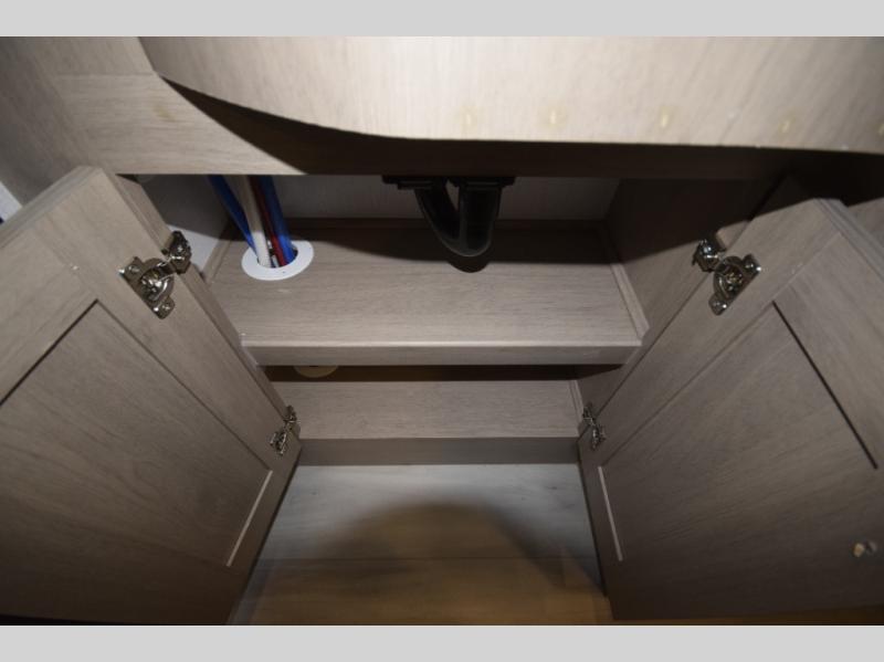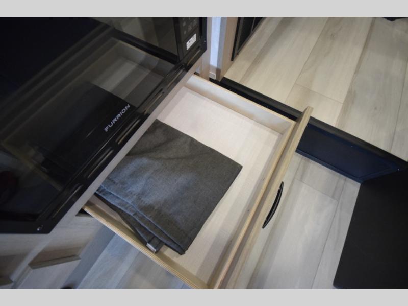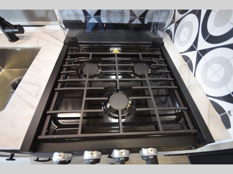 The kitchen is built for real-life use, featuring a recessed 3-burner range, convection microwave, flip-up countertop extension, and a cordless 12V charging plate to keep your devices powered. Whether you're making a quick breakfast or a campsite dinner, everything you need is right at your fingertips.
