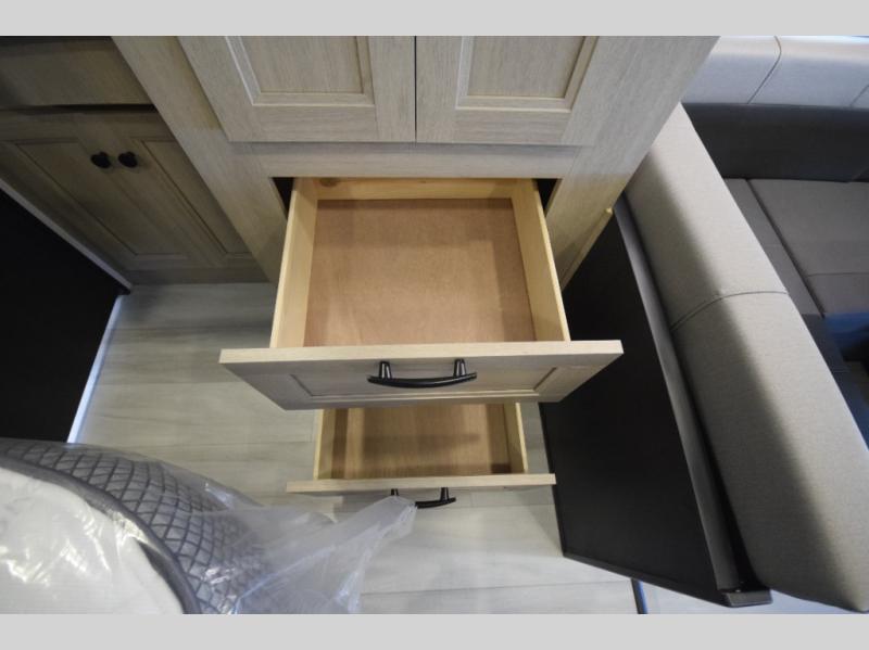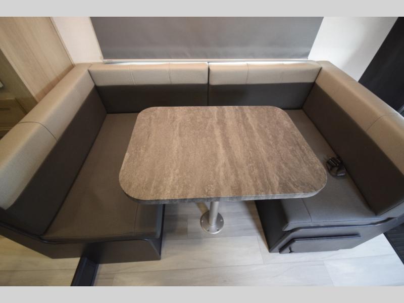 Traveling with friends or family? The U-shaped dinette offers seating for meals, games, or relaxing—complete with seatbelts for four and deep storage drawers underneath. At night, the dinette easily converts into an extra sleeping space.