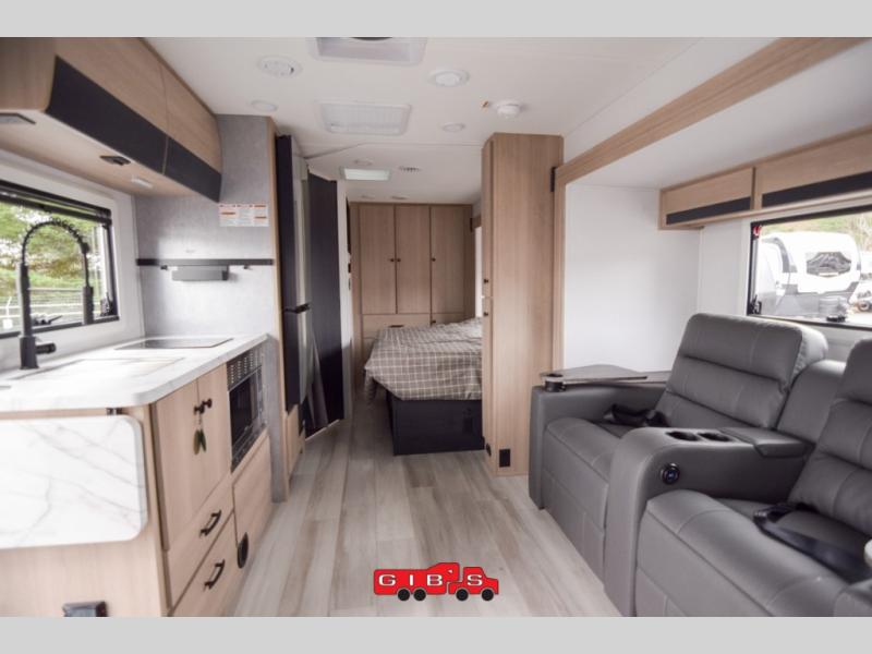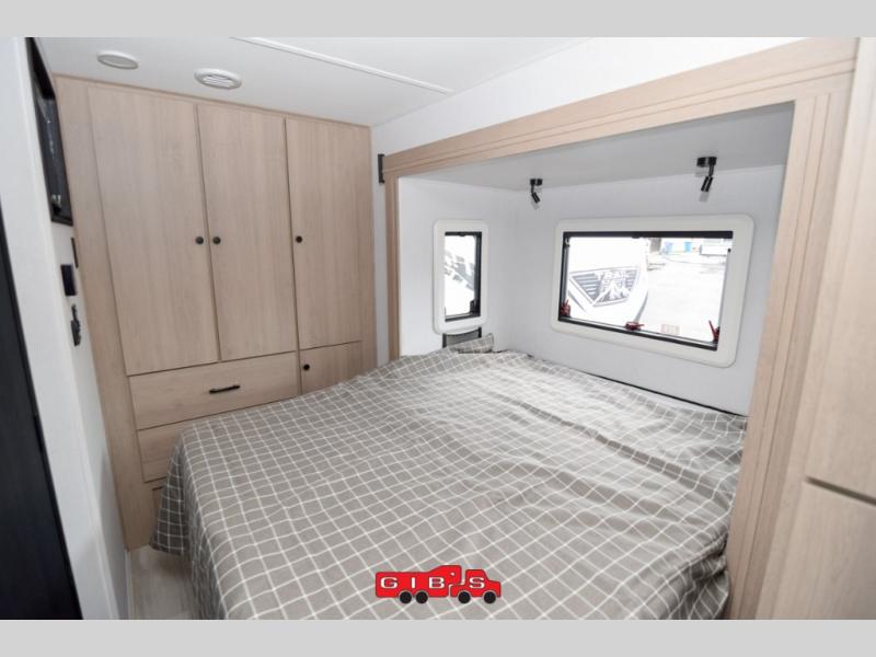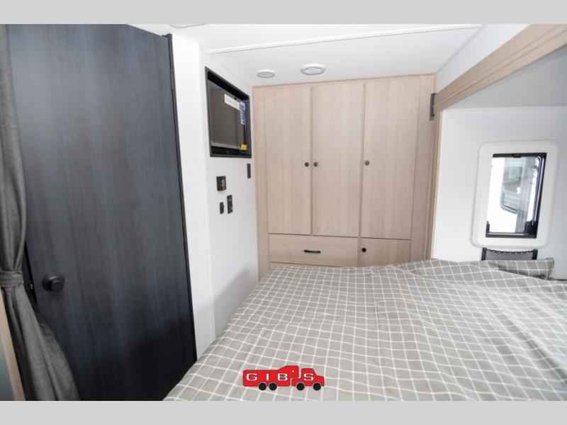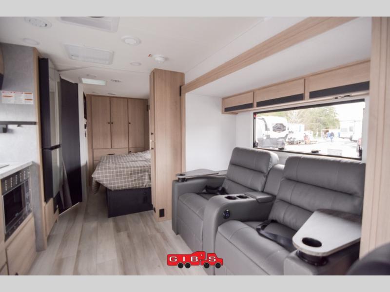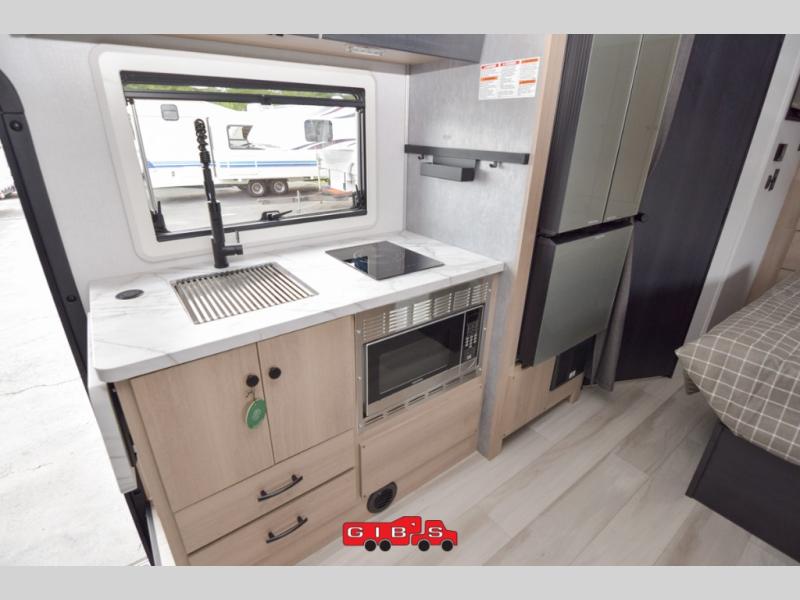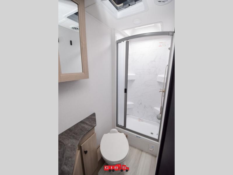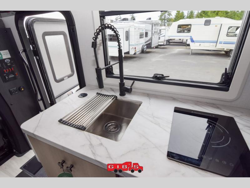 Everything you need is found in this cozy motorhome for five to six people. The swivel captain's seats can become a part of the living area once you park, and your guests can gather around the U-shaped dinette slide for game night. Your meals can be prepared each day on the induction cooktop with a convection microwave, and the flip-up counter will provide more prep space. There is also a 10.7 cu. ft. 12V refrigerator for food storage. The bedroom features a queen bed slide, 12V TV, plus a wardrobe to keep your clothes organized. A 60" x 80" cab-over bunk provides more sleeping space, or you can choose the optional Trekker cap with a built-in entertainment center!