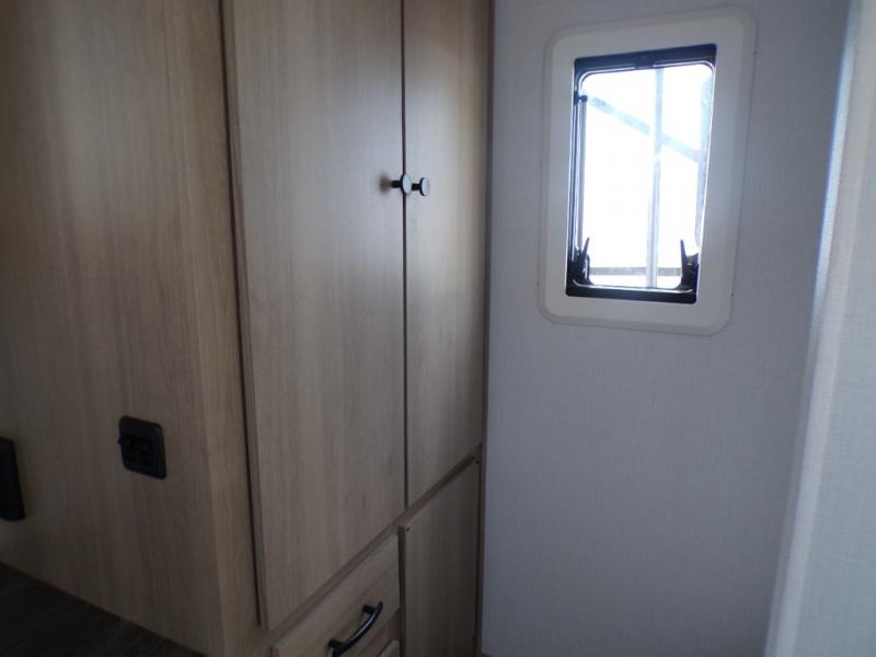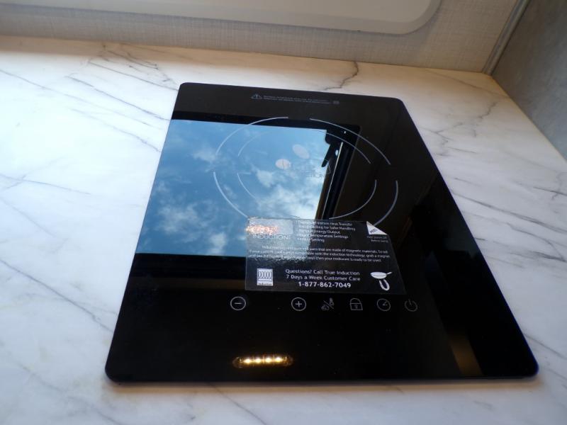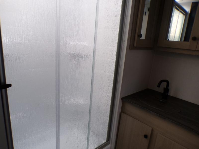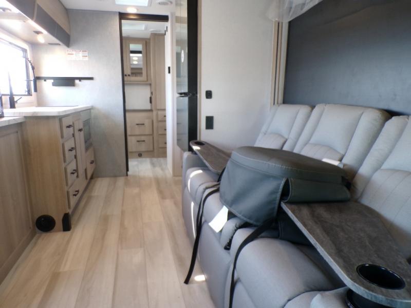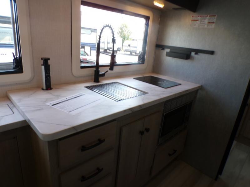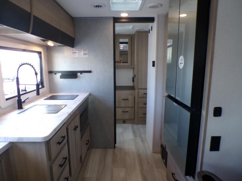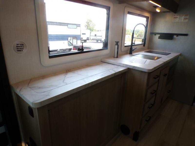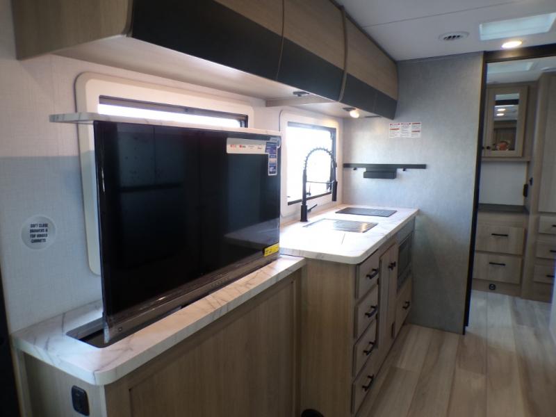 Trips across the state are made cozy in this single slide out coach for two! Once you've parked for the day, you can make lunch on the recessed induction cooktop or in the convection microwave. The sofa slide out provides a place to relax, and the Murphy bed can be folded out when you're ready for some shut-eye. You will appreciate how spacious the full rear bath is, and there is a wardrobe plus a linen closet here for ample storage. The cab-over bunk is only available with the Trekker Cap option; see dealer for more details.