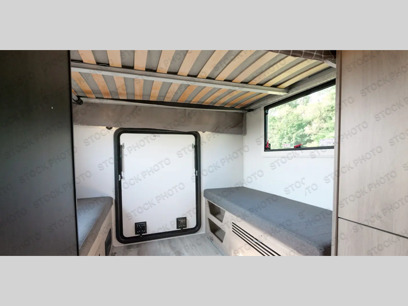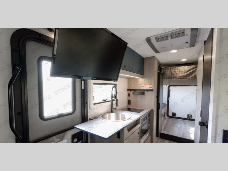 This compact coach is ready for adventure when you are! The swivel captain's seats can be turned around once you park so you can visit with those on the sofa. The mid-coach full bath will allow you to freshen up daily, and there is a shower skylight to provide more head room and natural lighting. When you're ready for lunch, you can prepare it on the single burner induction cooktop or in the microwave with an air fryer. There is also a flip-up countertop for more prep space plus a 12V refrigerator and pantry for food storage. In the back there are dual cabinets below a Euro power lift bed that will provide versatile sleeping space, plus there is a rear access door to let fresh air in and easily unpack gear!