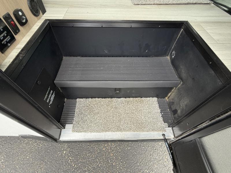 Exterior: Features a 15-foot power awning with LED lighting, heated exterior mirrors, roto-cast storage compartments, and modern fiberglass body styling.