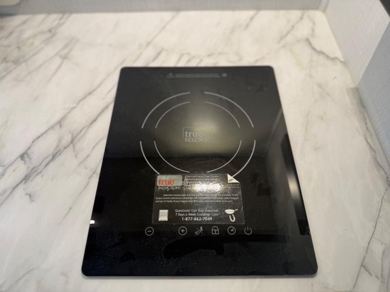 Kitchen: Includes a two-burner recessed stove, convection microwave, and a 5.3 cubic foot dual-power refrigerator.