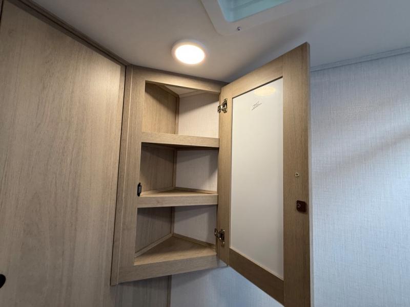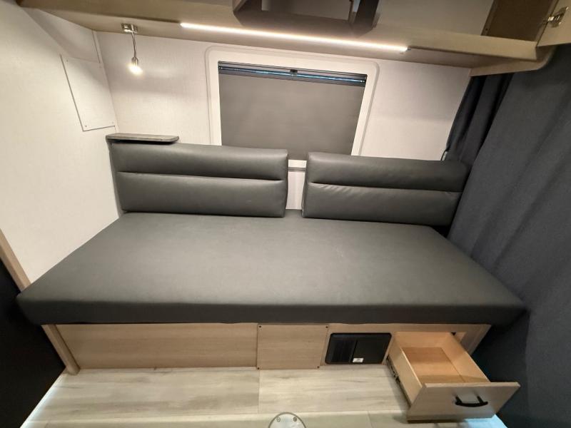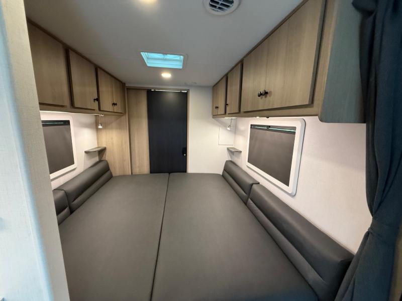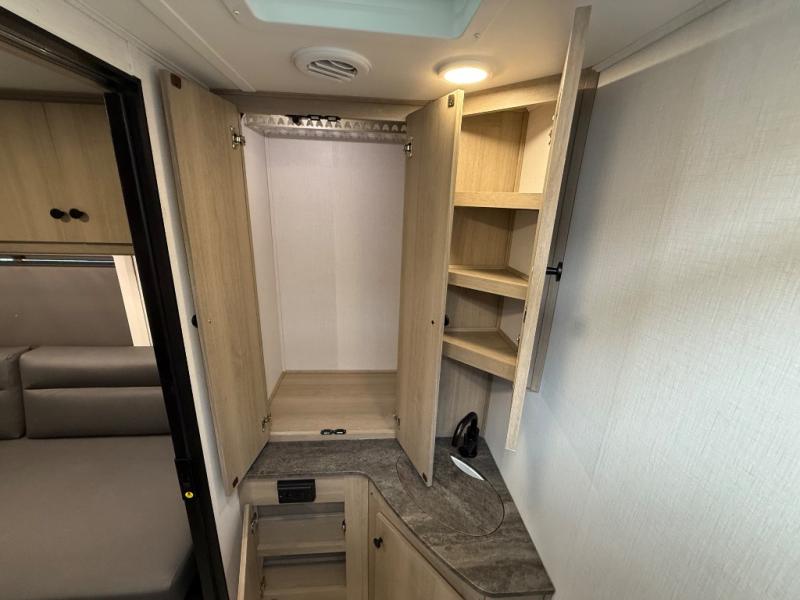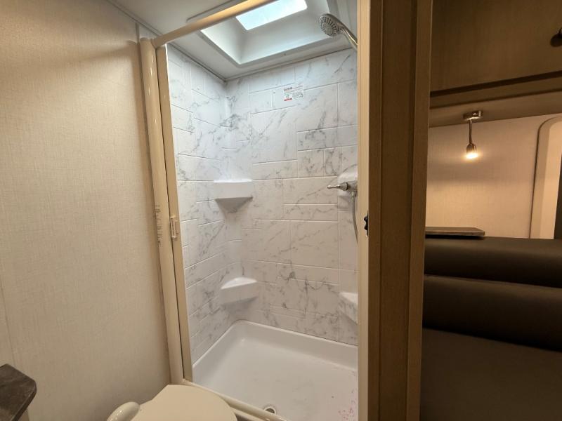 Trips across country or state are made comfortable in this motorhome for two. The twin beds convert to a queen-size bed so you can set up your sleeping arrangements to what works for you. The full rear bath includes a 24" x 36" shower and a wardrobe to store clean towels, and you'll find plenty of overhead compartments for all your belongings. Each morning you can prepare breakfast on the induction stove top, or use the convenient convection microwave. There is a 5.3 cu. ft. lightweight LP/electric 110V refrigerator , plus the flip-up counter will provide more prep space!