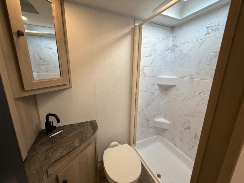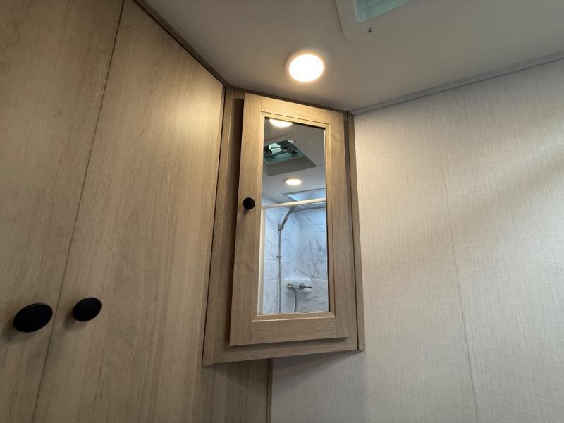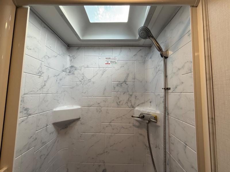 Bathroom: Full rear bath with a spacious shower, oxygen-infused shower head, wardrobe storage, and motion-sensor lighting.