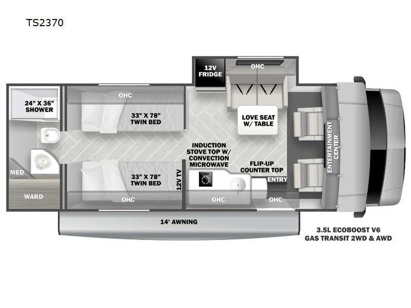 With any Sunseeker TS (Transit Series) Class C gas motorhome by Forest River you will enjoy eco-friendly materials and a fuel-efficient EcoBoost 3.5L V6 gas engine. The all wheel drive will allow you to go off-road when the adventure calls for it, and the backup camera/side view cameras with a 3-way monitor will make parking easier than ever. Some of the other exterior features you will appreciate are the roto-cast storage compartments, the outside shower, and the power awning with LED lights. Inside, you'll find black out roller shades, a shower skylight in the bath, swivel captain's seats, and a 12V USB charging station to keep your gadgets ready to go. You can stay connected to the outside world with the Winegard Air 360+ antenna, and each model includes Gateway 4G Wi-Fi capability and a 12V LED TV to keep you entertained.