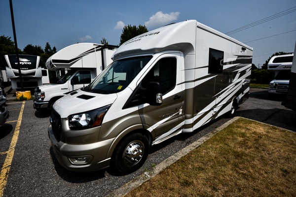 Looking for easy driving, comfortable sleeping arrangements, and a place to dine inside when you are on the road? This is the perfect couples coach with features like a wardrobe with drawers across from the side full bathroom with a shower, a double-size bed for two in the rear, plus full kitchen amenities. You will also find a 12V LED flat panel adjustable side TV and a 12V bedroom TV. There is an optional 190 watt 12V charging system available if you would like to add that feature for off-grid camping.