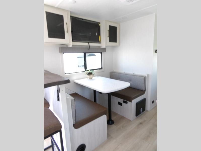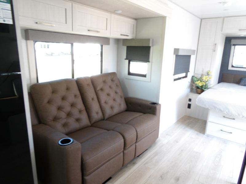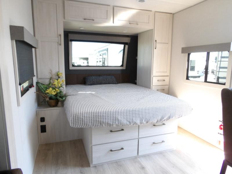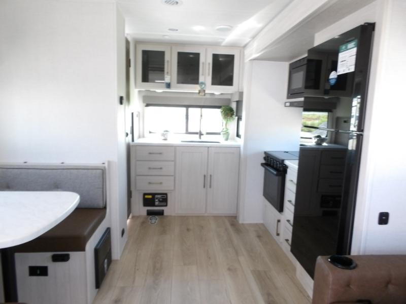 You'll love camping and spending time with loved ones in this spacious travel trailer. The 18' power awning with LED lights can be set up once you arrive at the campground, and you can unload camp gear from the pass-through storage. Head inside to make lunch on the residential range top or in the microwave oven. There is a booth dinette and tri-fold sofa for seating space, plus an additional counter with bar stools beside the dinette. A full bath onboard lets you clean up each day, and the front queen bed is sure to bring a great night's rest. There are also dual wardrobes to keep your space tidy and overhead storage for even more belongings.