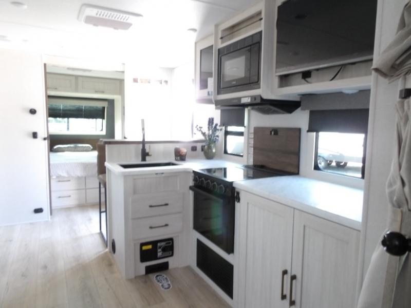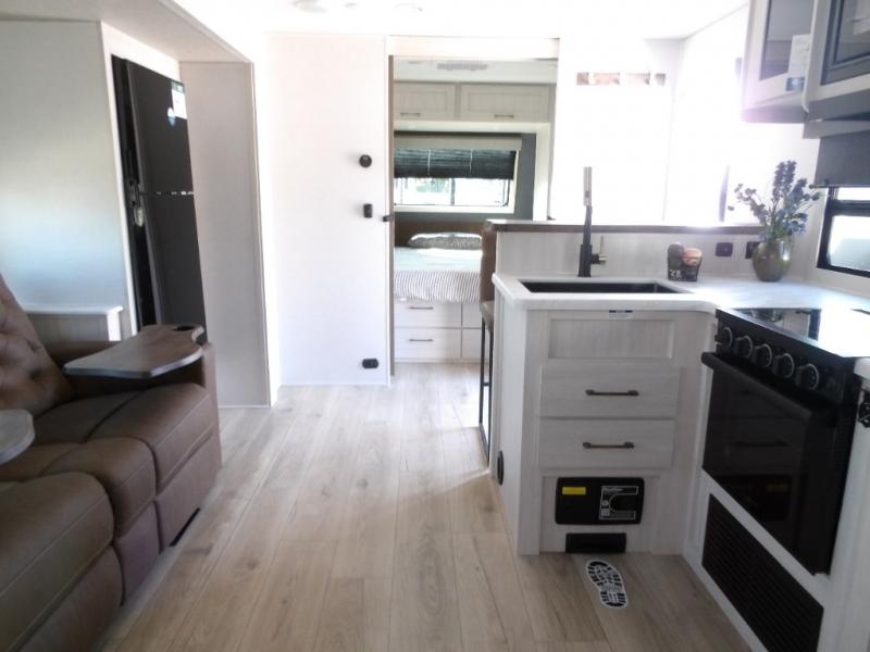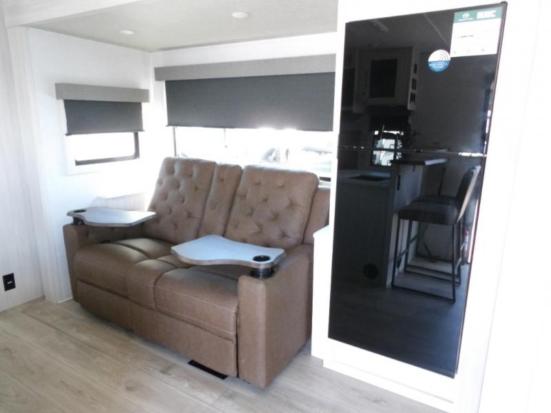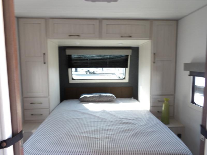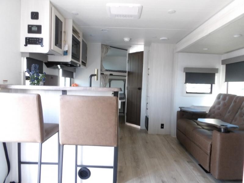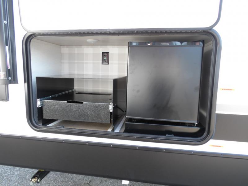 Every trip to the campground will be spent in comfort with this single slide out travel trailer. Once you arrive at the site, remove the kayaks or bikes from the rear storage door, start lunch on the outside kitchen, and put out the 15' power awning with LED lights. The interior includes a booth dinette slide with storage, a bar top with stools, plus an HD TV for movie nights. After a day of fun, head to the front private bedroom for a great night's rest on the queen bed, and you can store your belongings in the dual bedroom wardrobes!