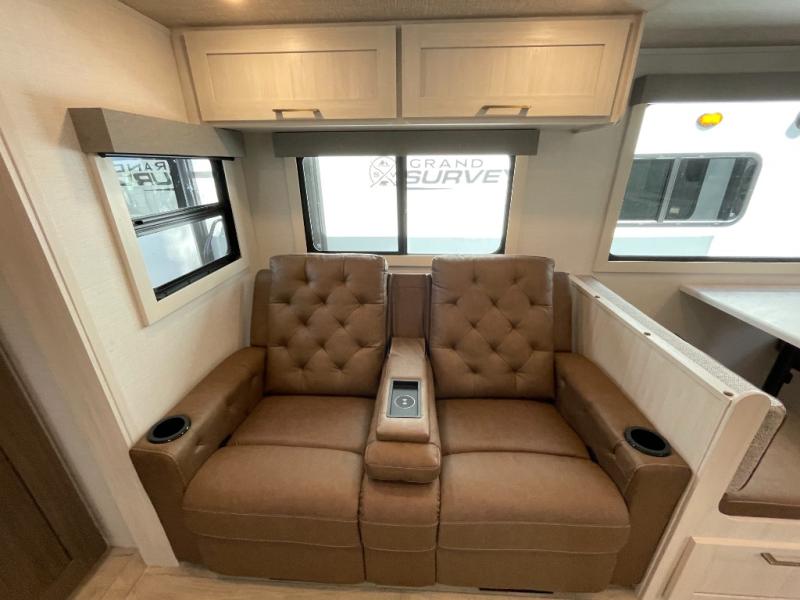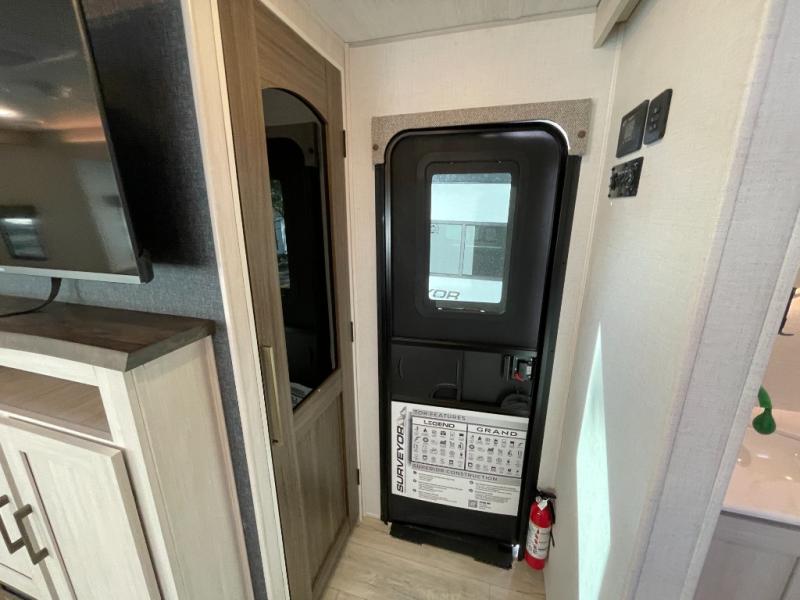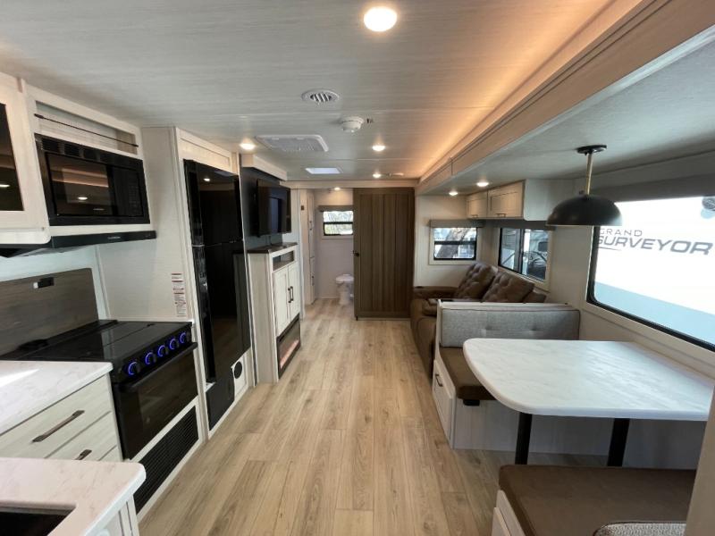 With any Grand Surveyor travel trailer by Forest River you will enjoy turn-key ready-to-go features and quality construction! Each model includes Azdel composite walls and a gel coated fiberglass front cap with an automotive style tinted windshield for a sleek look. There are friction hinge black glass entry door(s), an adjustable platform step with a night light, plus Goodyear tires and a power tongue jack for easy towing. The interior will have you feeling right at home with roller shades, residential faucets, sinks, and bathroom vanity, plus Surf(x) seamless countertops throughout. You can also plan for adventure with a 2" rear accessory and exterior spray port, and there are slam latch exterior baggage doors throughout to keep all your gear secure. Other stand-out features include a central vacuum system, a 200 watt solar panel with a 30 amp controller, a tankless water heater, carpet-free interiors, and the list goes on!