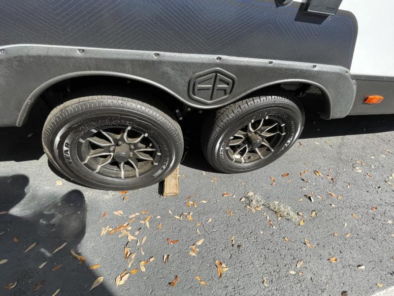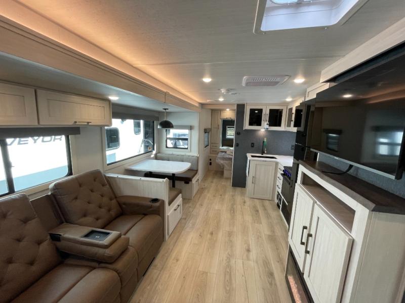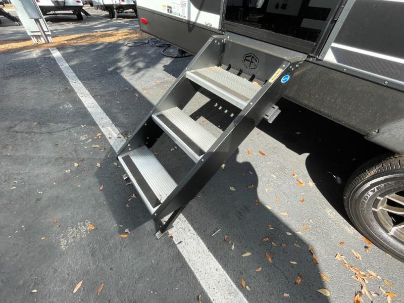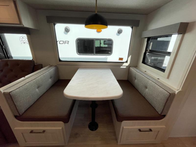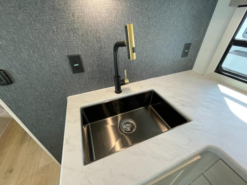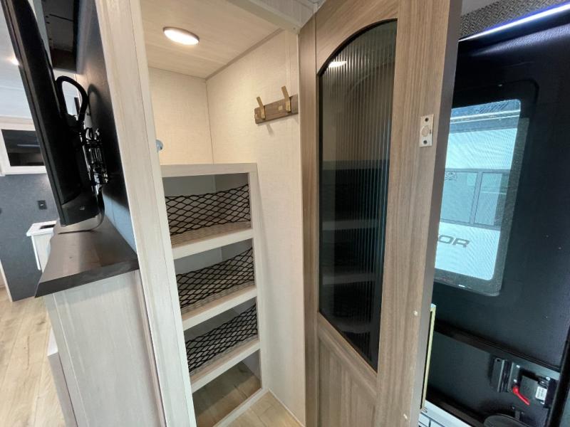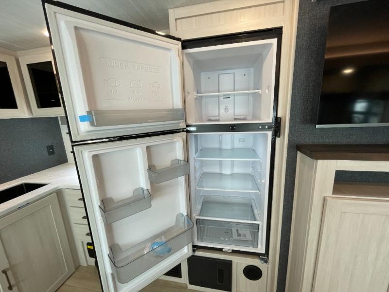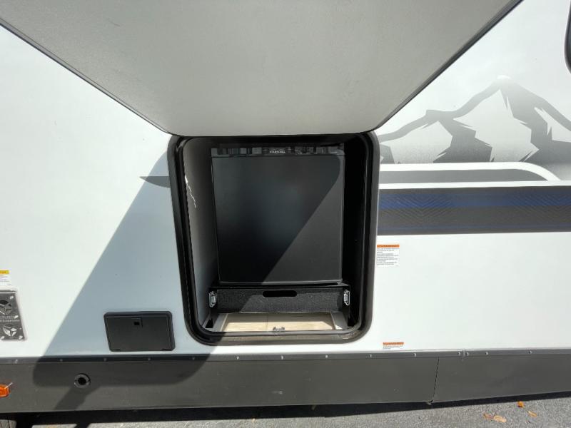 No need to rough it when you camp; this trailer offers amenities that allow you to "Glamp" if you want! The rear spacious bathroom is tucked away behind a beautiful barn door, and inside features a shower, wardrobe, and linen storage. The front master bedroom offers privacy, a walk-around custom king bed, dual wardrobes and underbed storage, plus TV prep if you want the option to watch movies in bed. The L-shaped counter in the kitchen provides enough space to have everything at your fingertips while you cook, plus there is a countertop extension for more prep and serving space if needed. A nice walk-in pantry just inside the entry door will be perfect for chips and snacks or canned goods for those longer camping trips. If dining inside, the booth dinette with pull-out dinette drawers will be comfortable plus you will enjoy the view provided by the panoramic windows within the slide out. An outside kitchen will be a favorite for anyone that cooks, and the 19' awning will provide some protection and offering an outdoor living area to enjoy with everyone.