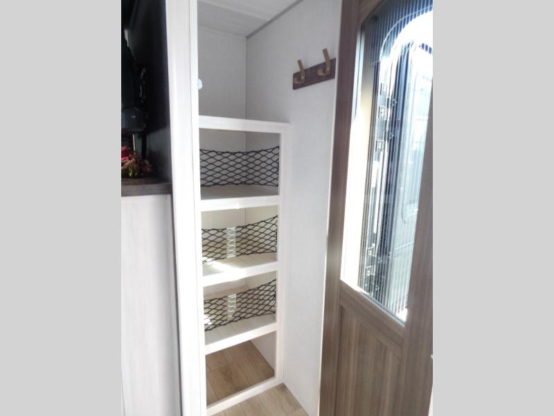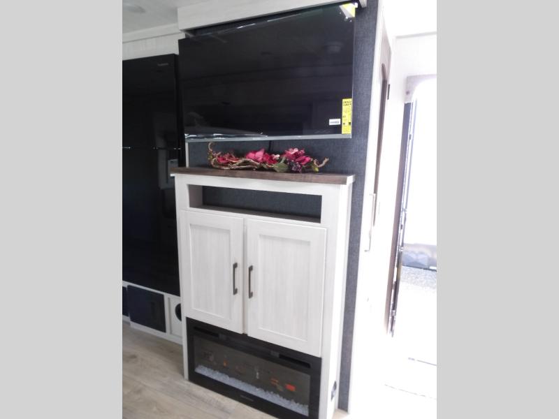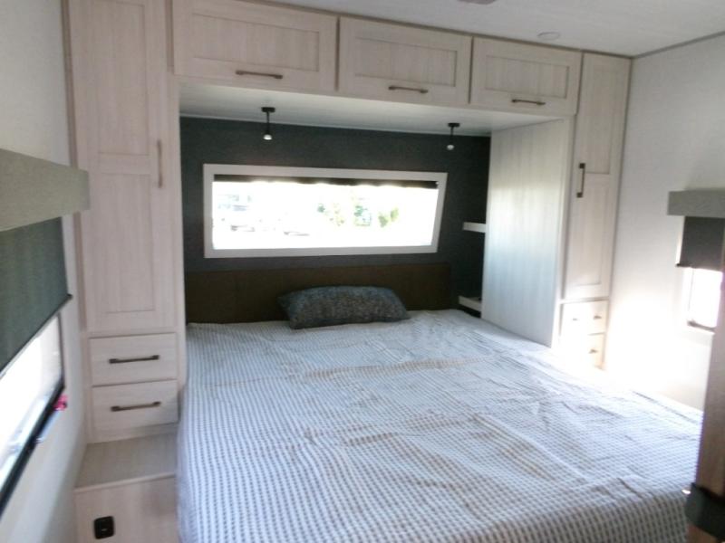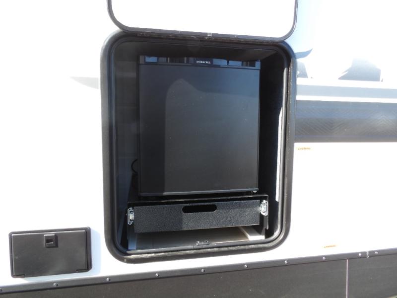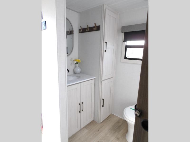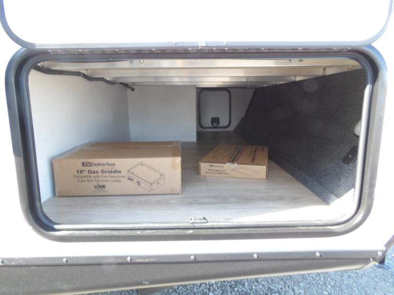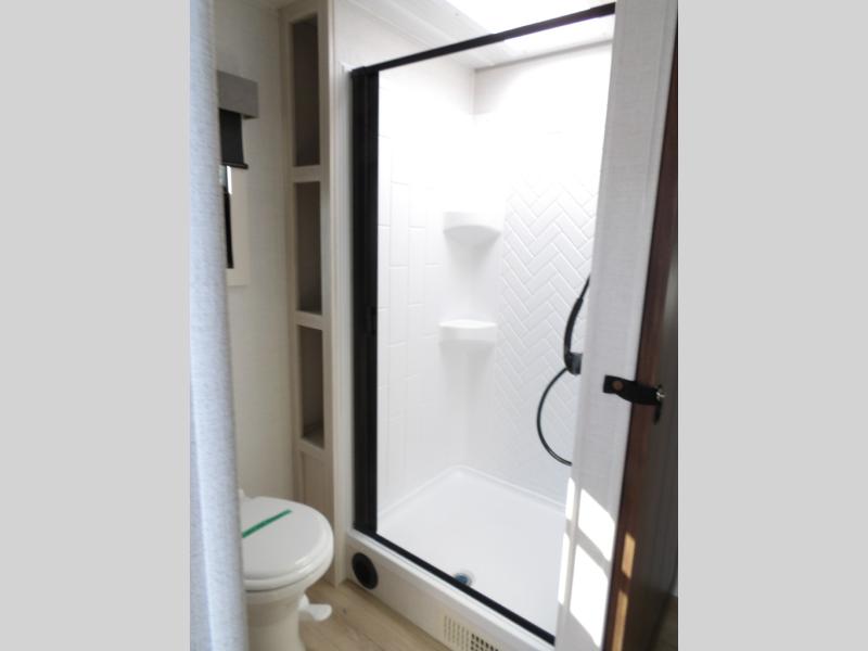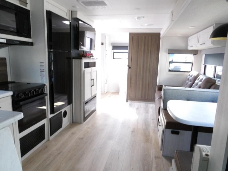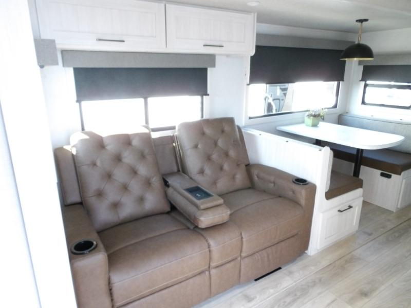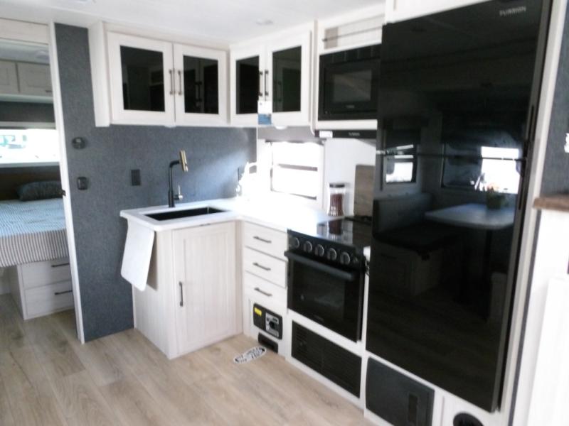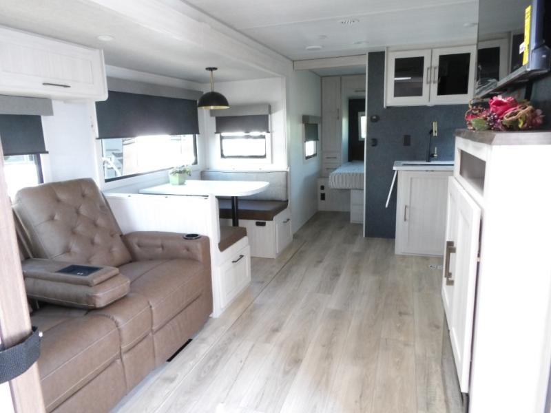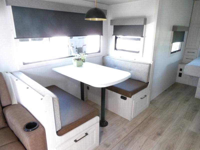 No need to rough it when you camp; this trailer offers amenities that allow you to "Glamp" if you want! The rear spacious bathroom is tucked away behind a beautiful barn door, and inside features a shower, wardrobe, and linen storage. The front master bedroom offers privacy, a walk-around custom king bed, dual wardrobes and underbed storage, plus TV prep if you want the option to watch movies in bed. The L-shaped counter in the kitchen provides enough space to have everything at your fingertips while you cook, plus there is a countertop extension for more prep and serving space if needed. A nice walk-in pantry just inside the entry door will be perfect for chips and snacks or canned goods for those longer camping trips. If dining inside, the booth dinette with pull-out dinette drawers will be comfortable plus you will enjoy the view provided by the panoramic windows within the slide out. An outside kitchen will be a favorite for anyone that cooks, and the 19' awning will provide some protection and offering an outdoor living area to enjoy with everyone.