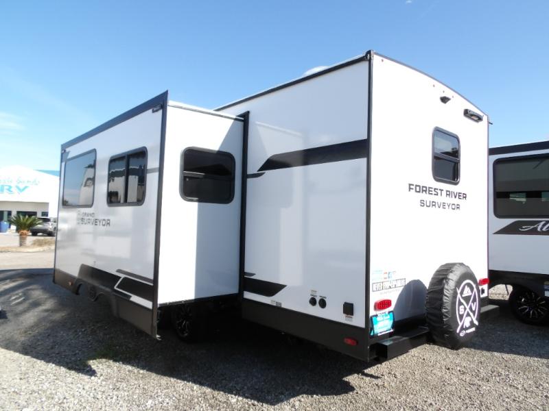 With any Grand Surveyor travel trailer by Forest River you will enjoy turn-key ready-to-go features and quality construction! Each model includes Azdel composite walls and a gel coated fiberglass front cap with an automotive style tinted windshield for a sleek look. There are friction hinge black glass entry door(s), an adjustable platform step with a night light, plus Goodyear tires and a power tongue jack for easy towing. The interior will have you feeling right at home with roller shades, residential faucets, sinks, and bathroom vanity, plus Surf(x) seamless countertops throughout. You can also plan for adventure with a 2" rear accessory and exterior spray port, and there are slam latch exterior baggage doors throughout to keep all your gear secure. Other stand-out features include a central vacuum system, a 200 watt solar panel with a 30 amp controller, a tankless water heater, carpet-free interiors, and the list goes on!