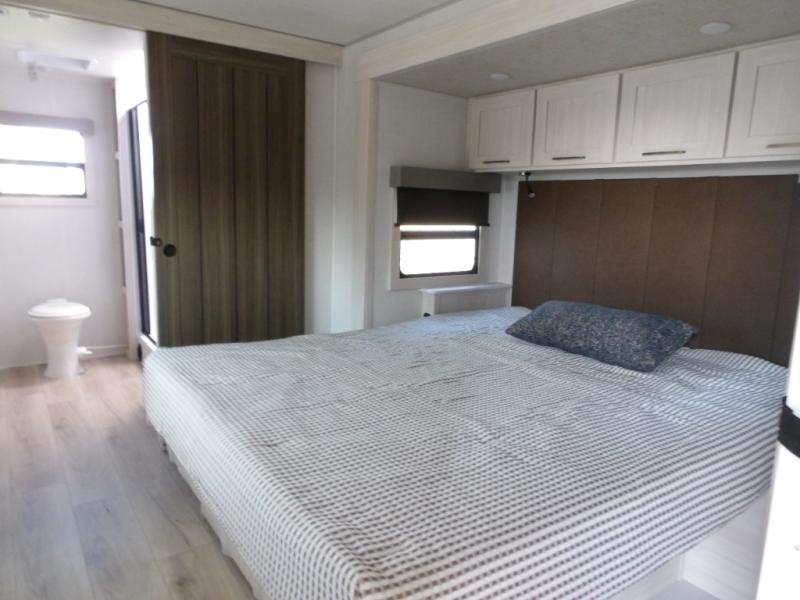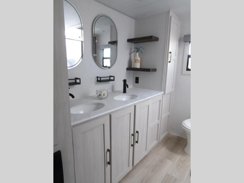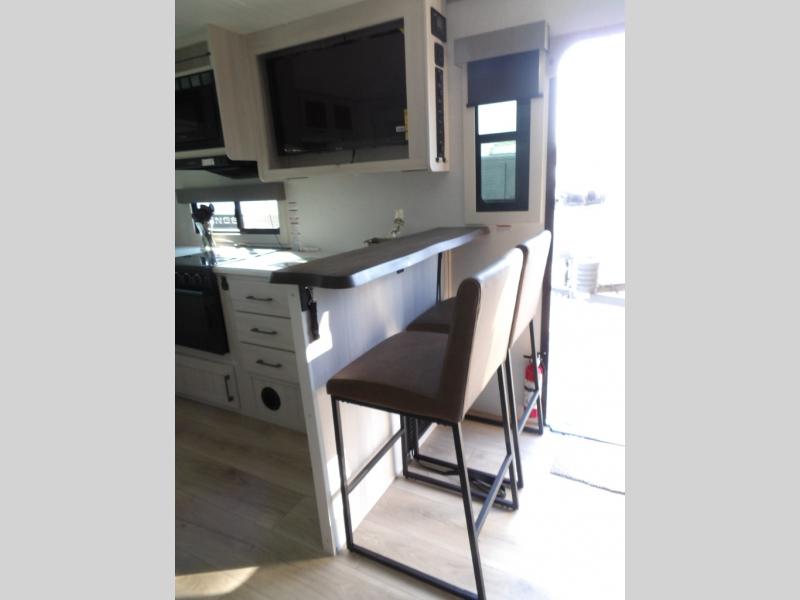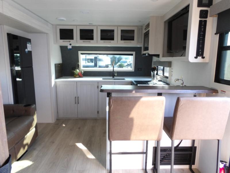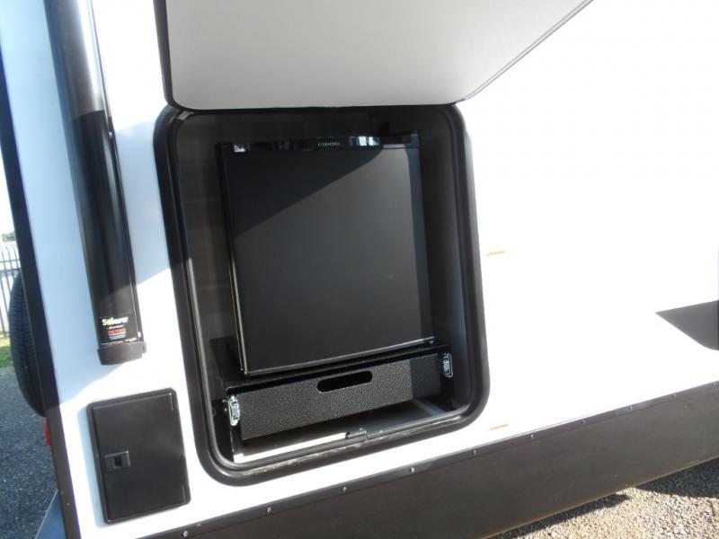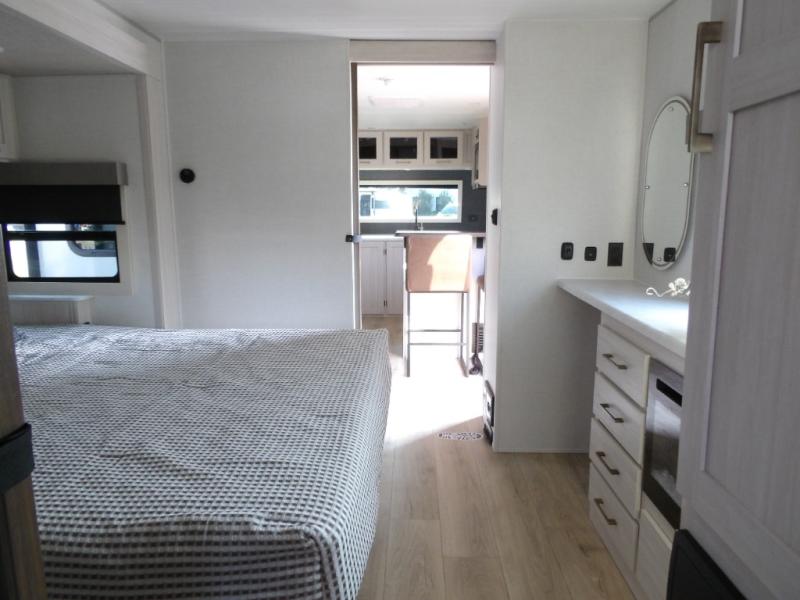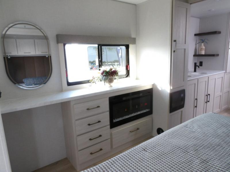 This couple's trailer will be giving you all the glamping vibes! There is a front kitchen with ample counter space, along with a counter with two bar stools, a central vacuum to easily clean up, and a slide out for more space! The second slide out is found in the middle master bedroom where you'll also enjoy a custom king bed across from a bedroom fireplace, a wardrobe, and a dresser with TV prep. Head towards the back and you'll be wowed by the full bath with dual bath sinks, an upgraded slow-close shower door, and a closet with washer and dryer prep. The exterior is just as impressive as the interior with its outside kitchen, 20' power awning with LED lights, pass-through storage, TV coax, and so much more!
