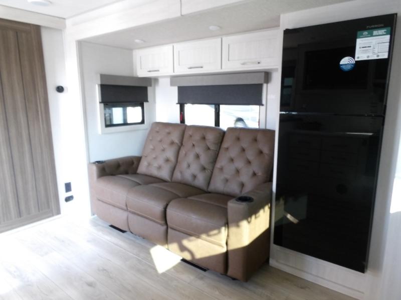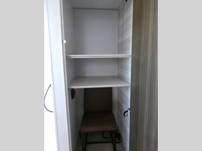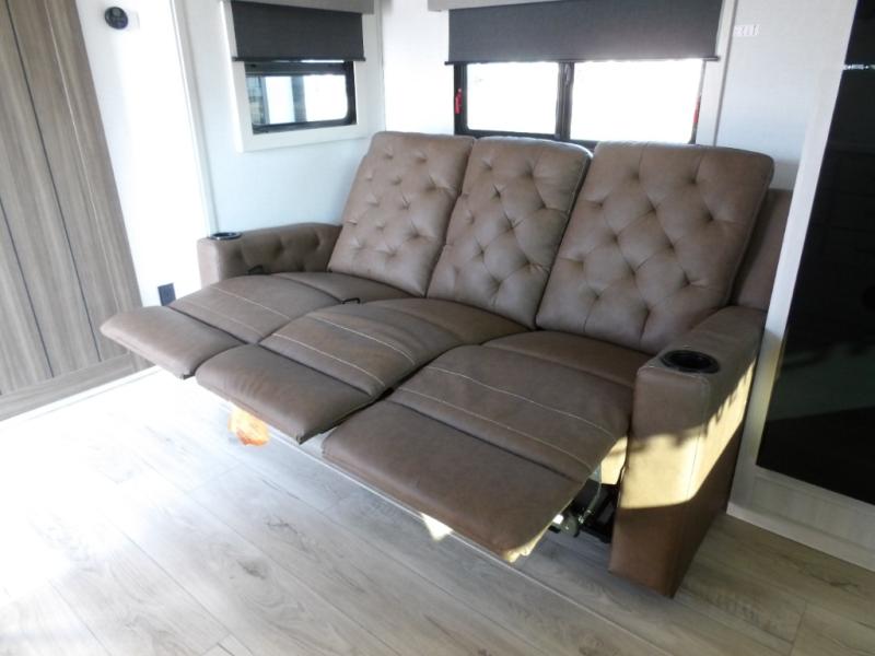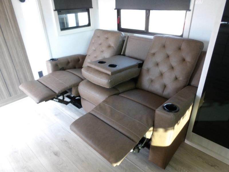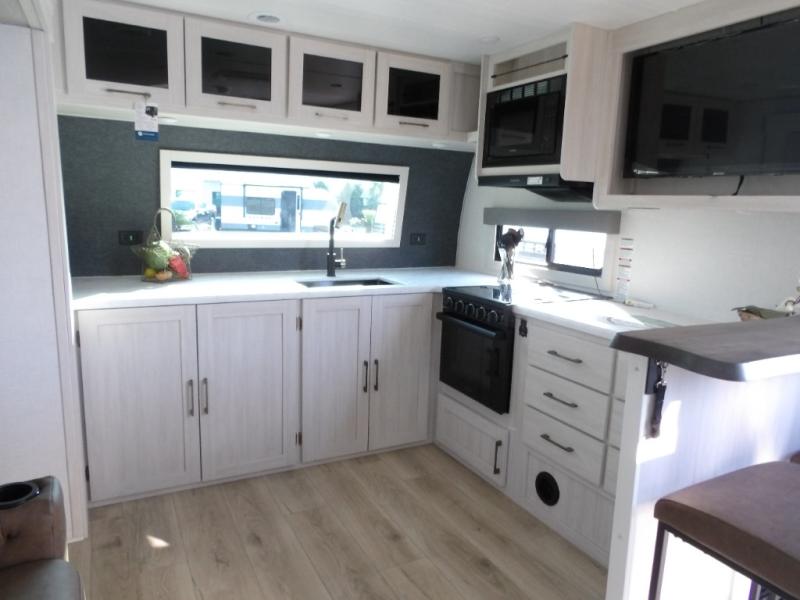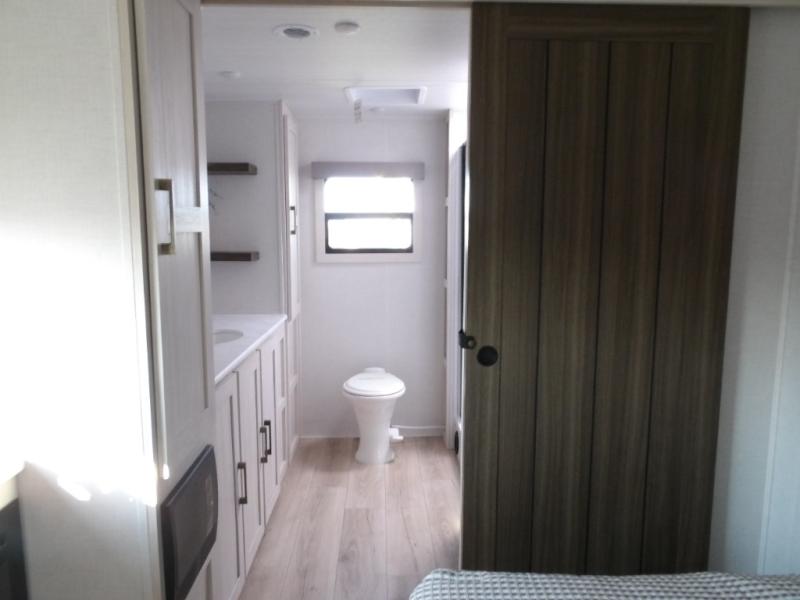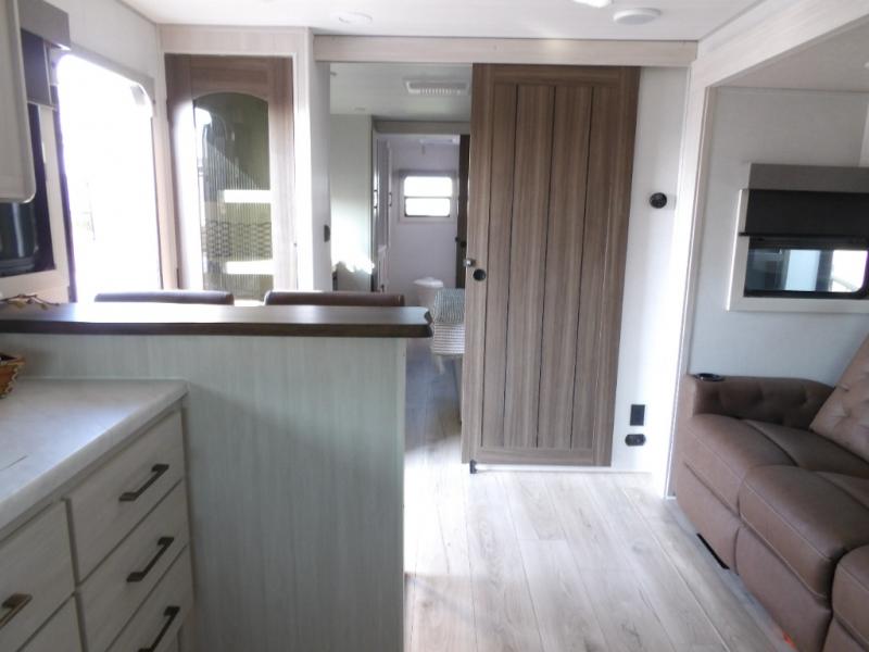 This couple's trailer will be giving you all the glamping vibes! There is a front kitchen with ample counter space, along with a counter with two bar stools, a central vacuum to easily clean up, and a slide out for more space! The second slide out is found in the middle master bedroom where you'll also enjoy a custom king bed across from a bedroom fireplace, a wardrobe, and a dresser with TV prep. Head towards the back and you'll be wowed by the full bath with dual bath sinks, an upgraded slow-close shower door, and a closet with washer and dryer prep. The exterior is just as impressive as the interior with its outside kitchen, 20' power awning with LED lights, pass-through storage, TV coax, and so much more!