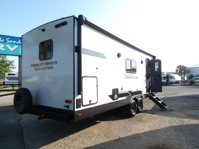 With any Grand Surveyor travel trailer by Forest River you will enjoy turn-key ready-to-go features and quality construction! Each model includes Azdel composite walls and a gel coated fiberglass front cap with an automotive style tinted windshield for a sleek look. There are friction hinge black glass entry door(s), an adjustable platform step with a night light, plus Goodyear tires and a power tongue jack for easy towing. The interior will have you feeling right at home with roller shades, residential faucets, sinks, and bathroom vanity, plus Surf(x) seamless countertops throughout. You can also plan for adventure with a 2" rear accessory and exterior spray port, and there are slam latch exterior baggage doors throughout to keep all your gear secure. Other stand-out features include a central vacuum system, a 200 watt solar panel with a 30 amp controller, a tankless water heater, carpet-free interiors, and the list goes on!