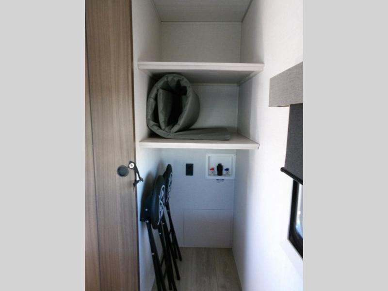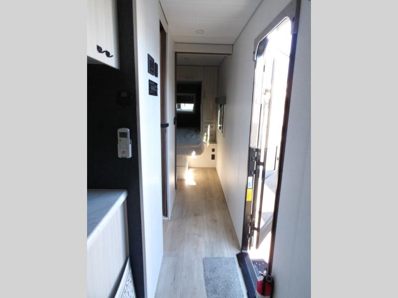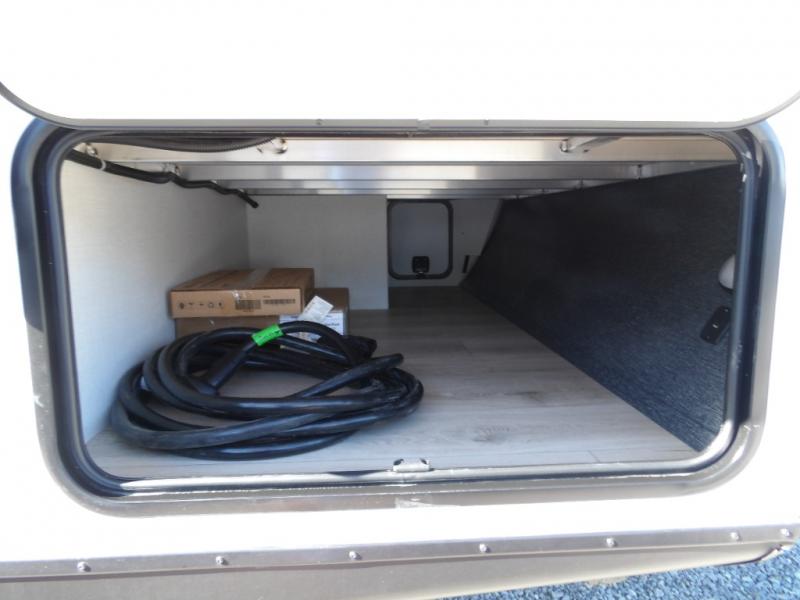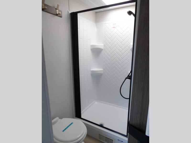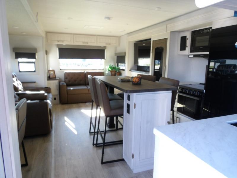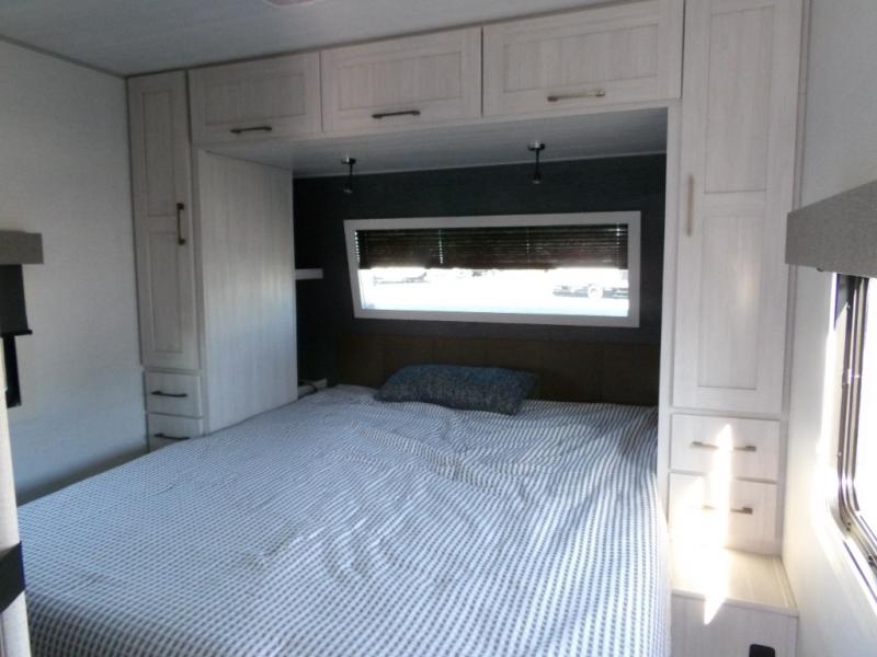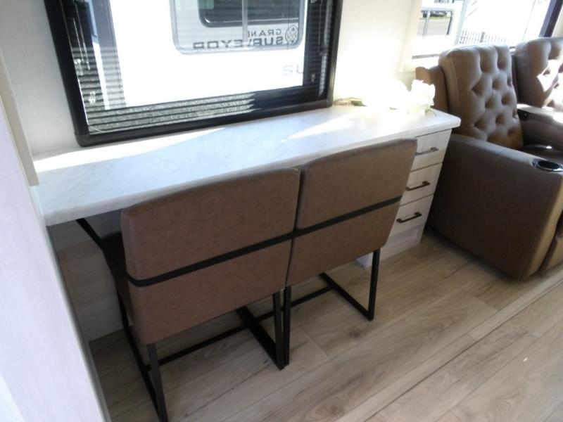If comfort is what you're looking for, you won't have to search far with this travel trailer! There are dual opposing slides in the main living area for maximum space. The kitchen that flows from the living room area features a high-top dinette that gives a more residential feel to this space, plus there is a pantry, overhead storage, a 10 cu. ft. 12V black glass refrigerator, and more kitchen features you are sure to love. The rear living area includes an EZ-out sofa bed to provide sleeping space for two overnight guests, and there is a theater seat across from the fireplace and HD TV. You'll also enjoy a refreshing drink at the bar top that can also function as a desk! When it's time to call it a night, you can clean up in the spacious full bath, then head to the front bedroom. There is a custom king bed here along with two wardrobes and overhead storage that makes organizing easy!